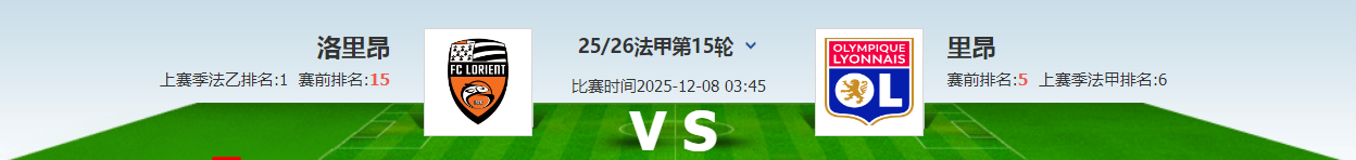 本场比赛是法甲第15轮的一场较量,由主场的洛里昂迎战里昂。洛里昂目前取得了3胜5平6负的成绩,积14分排在联赛第15位;里昂目前取得了7胜3平4负的成绩,积24分排在联赛第5位。