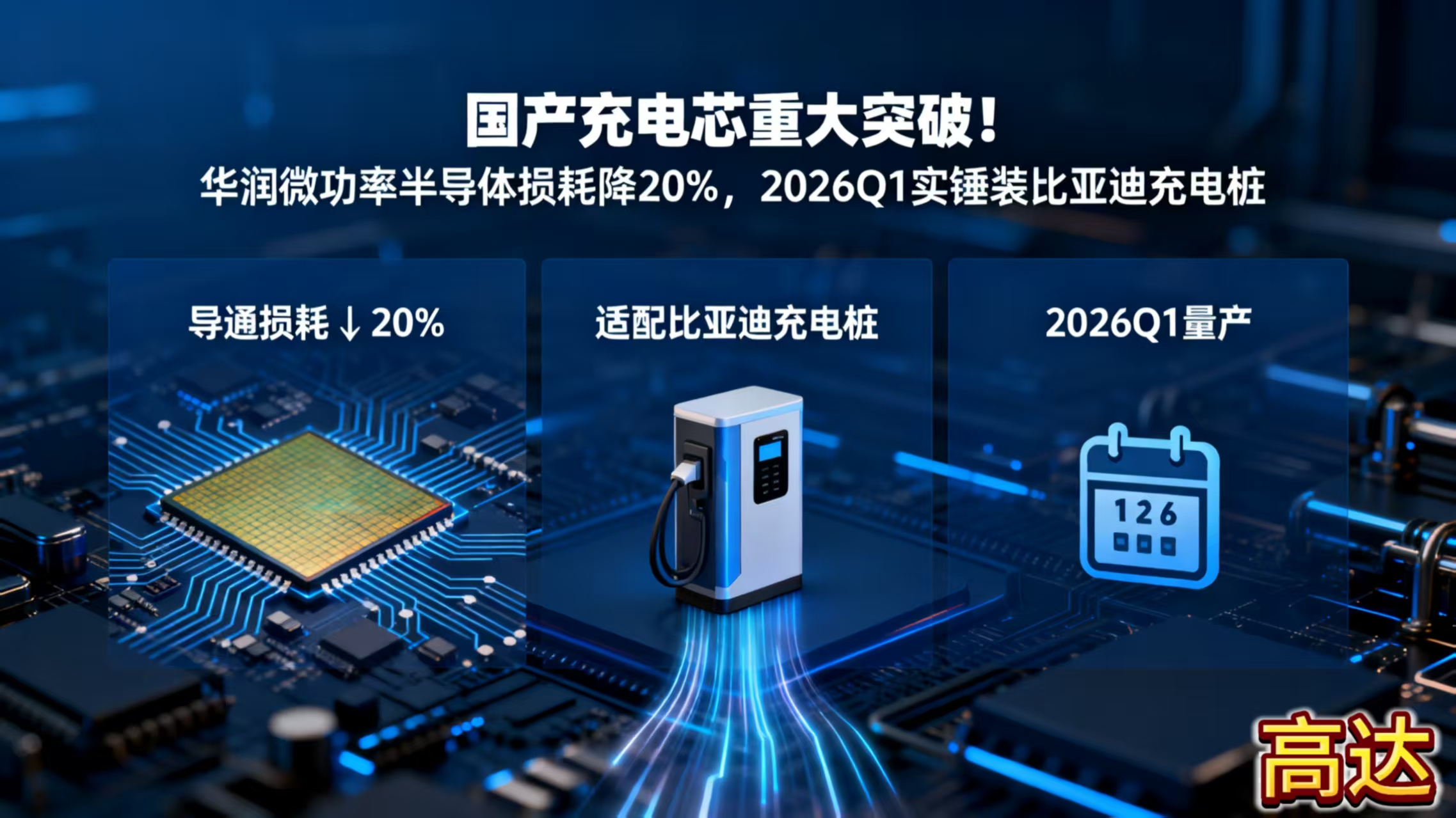新能源充电赛道爆出“关键性突破”!国内功率半导体IDM龙头华润微官方确认,旗下新一代车规级功率半导体已实现规模化量产,导通损耗较前代直降20%,适配比亚迪充电桩实测系统转换效率突破97%,通过AEC-Q101车规认证,2026年第一季度将正式批量装车 。消息一出行业震动:“国产功率芯终于撕开英飞凌壁垒!”“比亚迪充电桩成本要大降,充电效率再升级!”投资者沸腾:“12寸产线满产,车规业务占比冲25%,市值要乘风而起!”