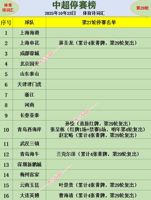中超第28轮:蒋圣龙、张呈栋等7人停赛,鲁沪迎对决,武深争保级