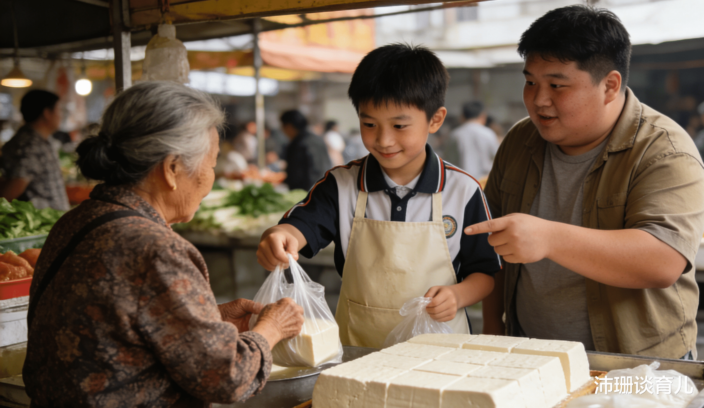 菜市场有个卖豆腐的老陈,他儿子小胖跟我儿子同校,比我们高两届。老陈媳妇走得早,他一个人带孩子,又要挣钱又要管饭,忙得脚打后脑勺。小胖经常放学了就在菜市场帮忙,称豆腐、找零钱,干得有模有样。我跟儿子说:“你去帮陈叔叔卖豆腐,妈妈在旁边看着。”儿子以为我在开玩笑。我说真的,去吧。