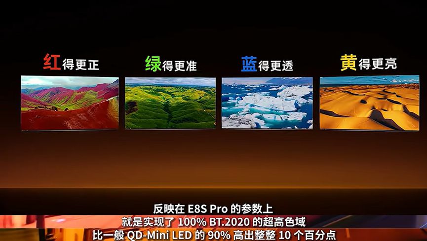 我认真看了网上的评测视频,了解到RGB-Mini LED的最大优势是RGB发光芯片能直接显示红绿蓝三原色,不用再依赖单色光源二次转换的传统技术,海信E8S Pro还有自研AI画质芯片,可以做到控光+控色,让电视同时具备100% BT.2020色域覆盖、近100%色彩纯度和超高亮度,是最接近大自然真实色彩的液晶显示技术。