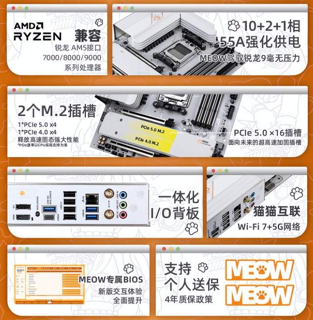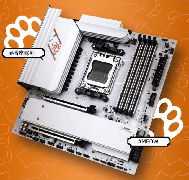 相信很多朋友对“橘猫主板”的印象停留在满是橘宝造型的主板,那是“小橘猫”主板。而真正的七彩虹B850M橘猫主板长下面这样,非常适合纯白主题的装机。