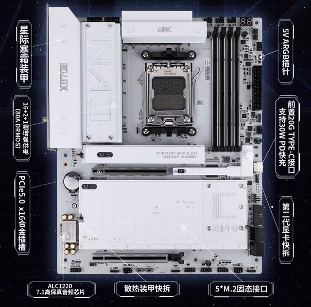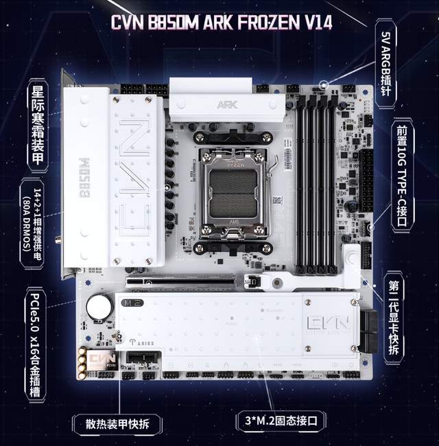 极具性价比的全能战将:七彩虹CVN B850M ARK FROZEN V14方舟主板:七彩虹CVN B850M ARK FROZEN V14主板不仅在外观上提供了纯白的出众体验,在易用性上也提升了一个高度,显卡快拆和M.2无工具快拆都有给到,十分省心。