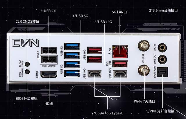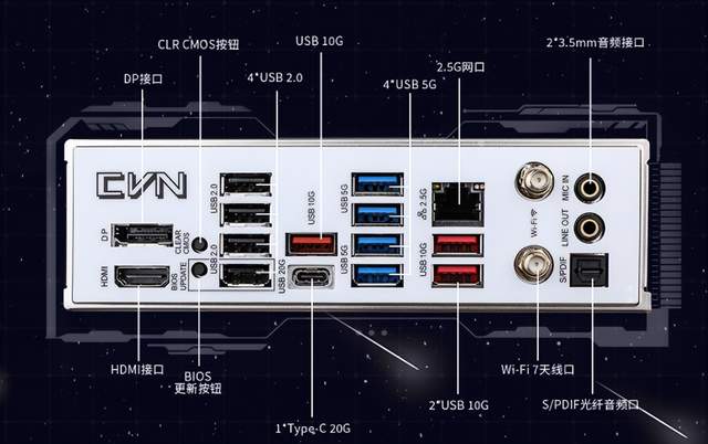 一体式I/O接口种类丰富,提供1个DP、1个HDMI、BIOS更新按钮、1个Type-C 5G、1个USB-A 10G、4个USB 2.0、2个USB-A 5G以及一组音频接口。网络连接方面让我眼前一亮,直接板载了5G有线网卡与最新的Wi-Fi 7无线网卡,为在线游戏和高速传输提供了超低延迟、高带宽的网络基础。