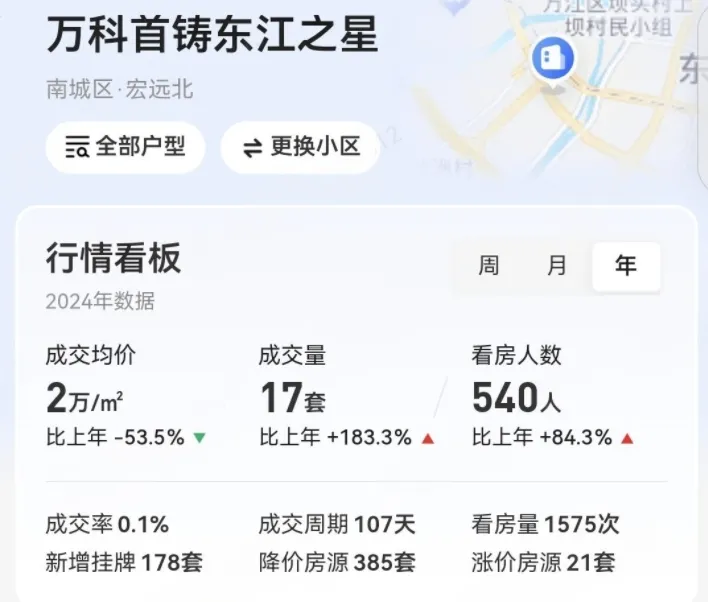 跌幅第三的是南城车站片区的万科金悦香树。这一年的成交均价是2.18万元/平米,价格同比暴跌了44.8%。
