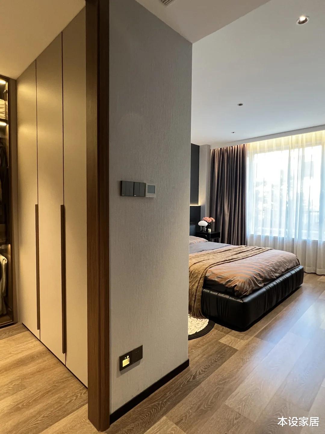 主卧是个套间,自带衣帽间和卫生间,地面铺设实木地板,墙面大面积留白,局部吊顶。