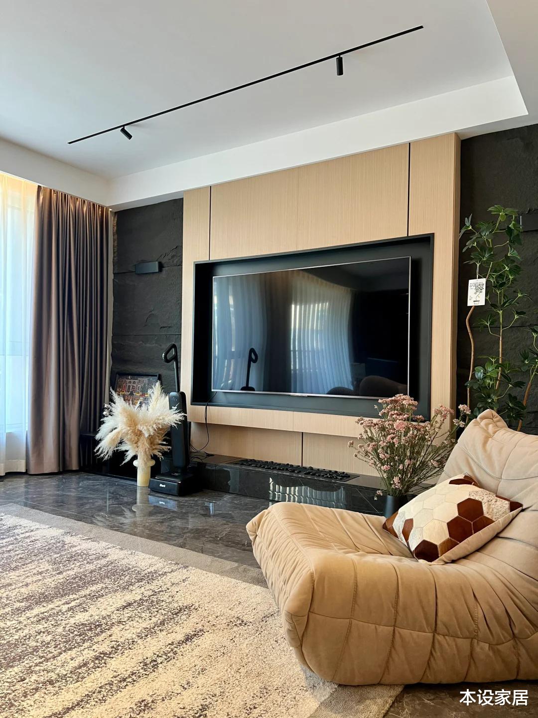 电视背景墙造型简约,以深色为基地,将电视机巧妙地嵌入式安装到“凹”造型中,看起来整洁,再搭配绿植和鲜花,带来一丝自然的呼吸。