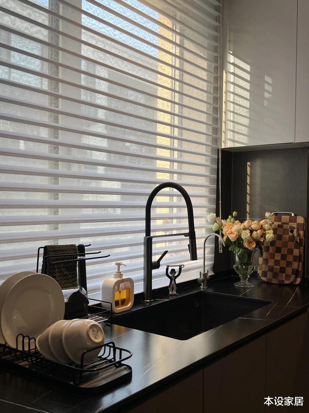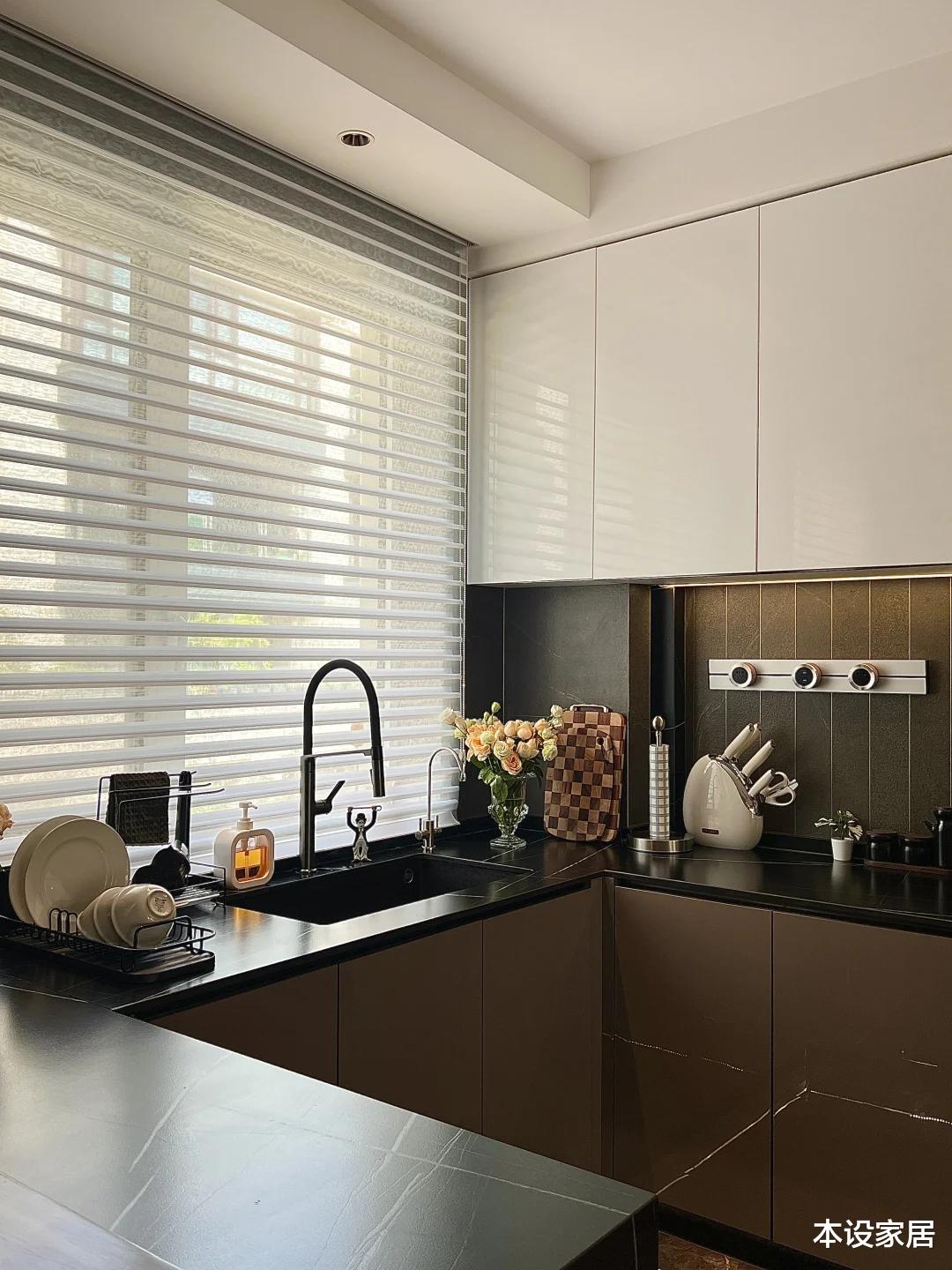 U型的厨房提供了更多的操作台面和储物空间,香槟色和乳白色的橱柜, 与黑色岩板台面的搭配, 在视觉上增加空间高级感,也平衡了烟火气息空间的“油腻感”。