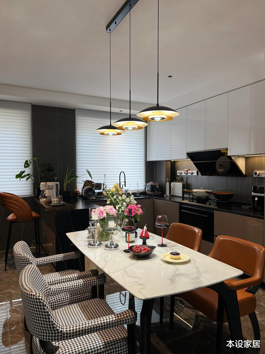 千鸟格和橘色的餐椅,搭配“飞碟”造型的吊灯,勾勒出餐厅的骨架,而白色岩板餐桌上的高脚红酒杯摆件无声诉说品味。
