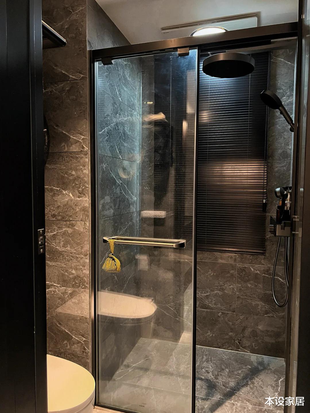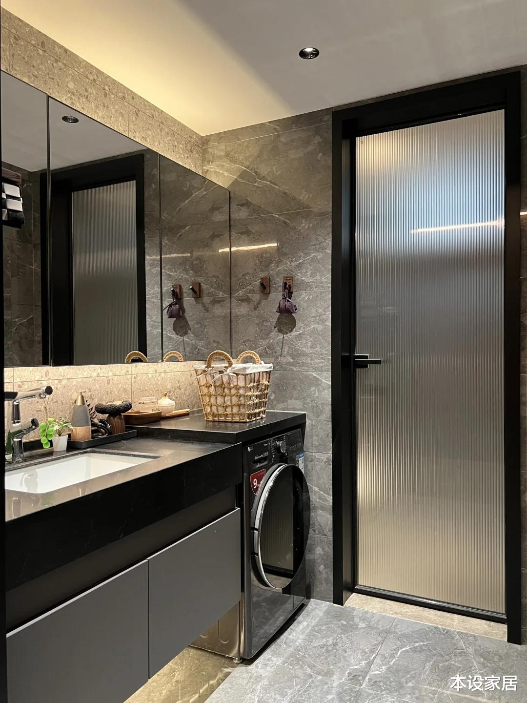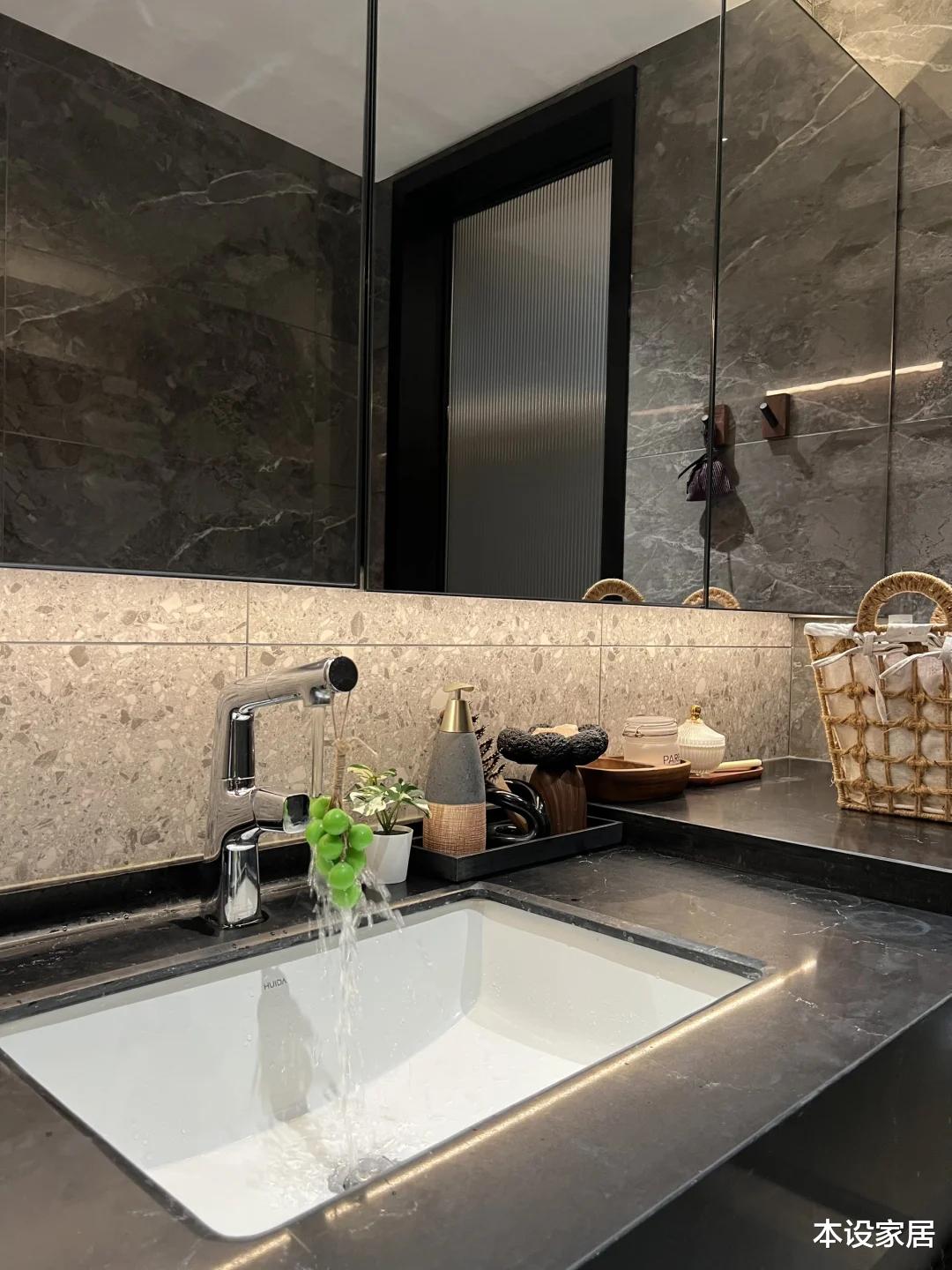 主卫与次卫基本保持一致,只是洗漱台融入原木色,与深灰石材营造出一份沉稳感,而充裕的空间置入浴缸,豪华感尽显。