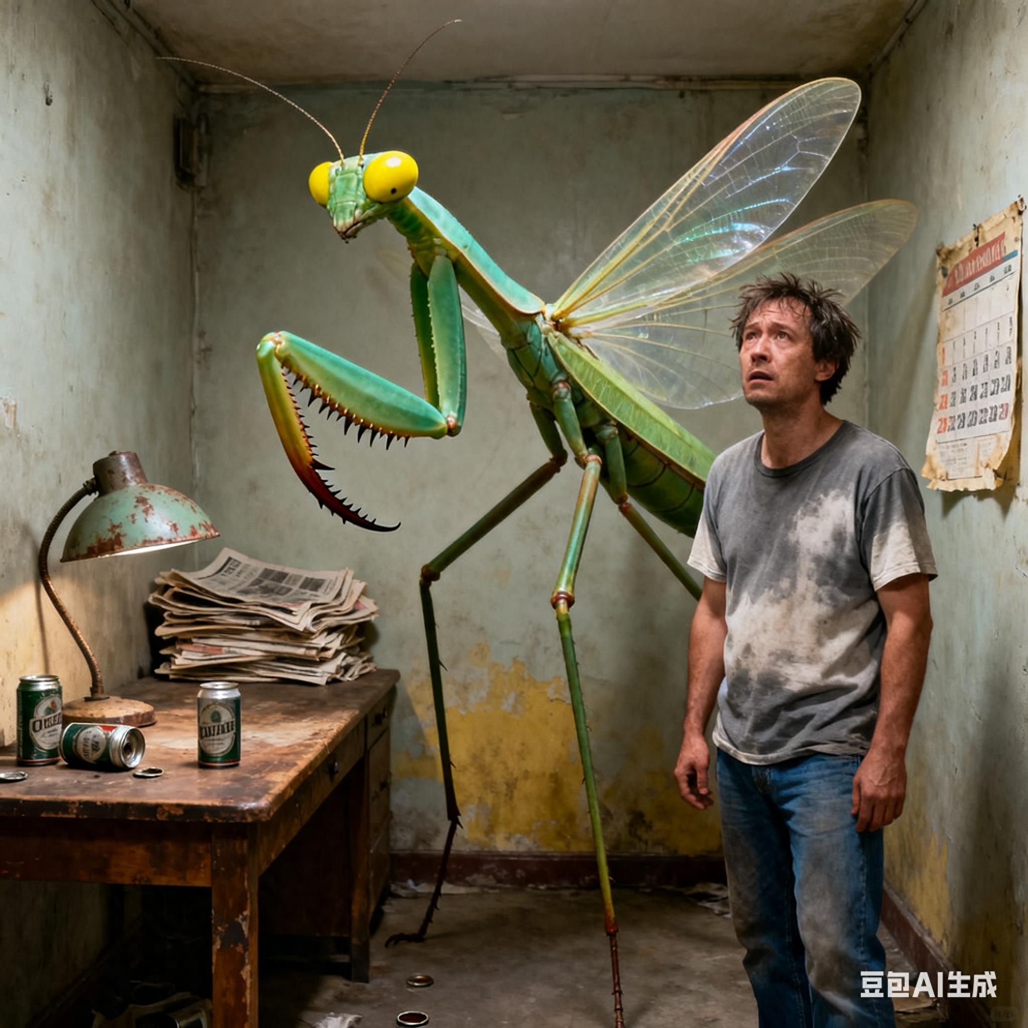 梦中的具体地点我记不太清,刚开始是在公司办公室,我和同事不知道因为什么事吵架了,刚要回自己的工作区,耳朵里突然就钻进去一只小虫子,不是苍蝇,是身体很硬的那种小飞虫,触感有点儿像蚂蚁,我直接抓住肚子给拽出来扔地上了,那只虫子跑的飞快,又钻到隔壁小屋里了,我跑进去一看,有一个中年人,长相普通,好像好几天没有刮胡子了,眼睛很小,还有点儿秃头,我很清楚,这个人我从来都没见过,但是他的脸无比的清晰,最恐怖的是他的旁边还飞着一只螳螂,特别大,预估有五十公分长,而且见到我之后那只螳螂就突然发狂,直接像我扑过来,我直接一个关门把螳螂关在那个屋里了,门上有个小的玻璃窗户,我可以看到里面,中间人始终一动不动,那只螳螂却越来越大,眨眼间长的和我一样大,不对!应该说比我还大一圈,整个门都被堵住了,力气非常大,整个门都在晃,然后中年人突然起身把螳螂拽住,然后回头跟我说(给钱)!我赶紧从兜里拿钱,我也不知道兜里为什么会有钱?我也不知道给他钱有什么用,然后他就把门挡住了,外面有好几个人,我也看不清里面发生了什么,等了一会儿,警察来了,应该是有人报警了,门一打开里面一片狼藉,好像经历了一场打斗,地上全是螳螂的皮,屋里除了中年人,还多出一个人,这个人长相和中年人一样,只不过个子很矮,而且非常胖,肤色是暗褐色,身上油腻腻的,反正不像活人,而且嘴里还吃着什么?发出咀嚼的声音,警察说要带走这俩人,这时中年人又说话了,他说你看到的小虫子和螳螂是“帕帕亚克”,它会无休无止的找你,你给钱,我给你挡着,如果不给,它就会吃掉你,然后我就被吓醒了!