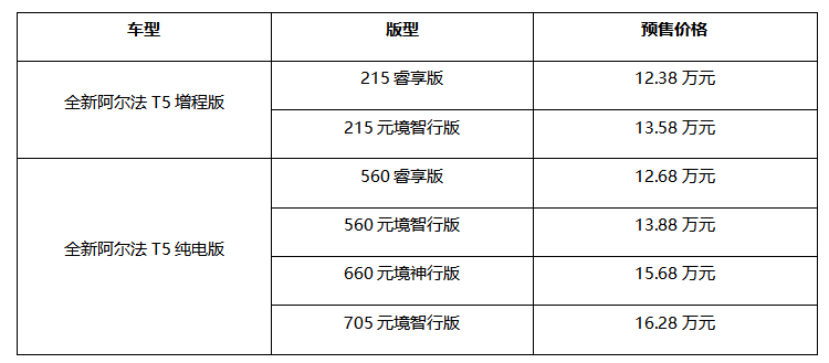 据悉,极狐全新阿尔法T5预售共推出6个版型,包含纯电和增程两种动力形式,预售价格12.38万元—16.28万元,以更年轻的设计风格、更强的动力续航、更智能的操控、更舒适的驾乘和天花板级的安全健康,为年轻家庭用户带来了中级SUV的新选择。即日起通过极狐APP或小程序支付2000元定金,购车可以享受整车5年或12万公里质保、三电终身质保、3年免费不限量数据流量、终身免费OTA升级、价值4999元充电桩安装抵扣券等四重礼遇,再次刷新中级SUV的价值标准!