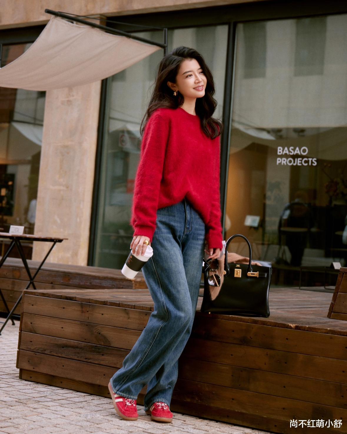 三木这套牛仔裤+针织衫的搭配心机也很简单,将针织衫前摆微微塞进裤腰,瞬间点明高腰线。选择红色针织衫+红色运动鞋,采用同色系的搭配,即可轻松出门,完美契合冬日温暖与时髦并重的需求。