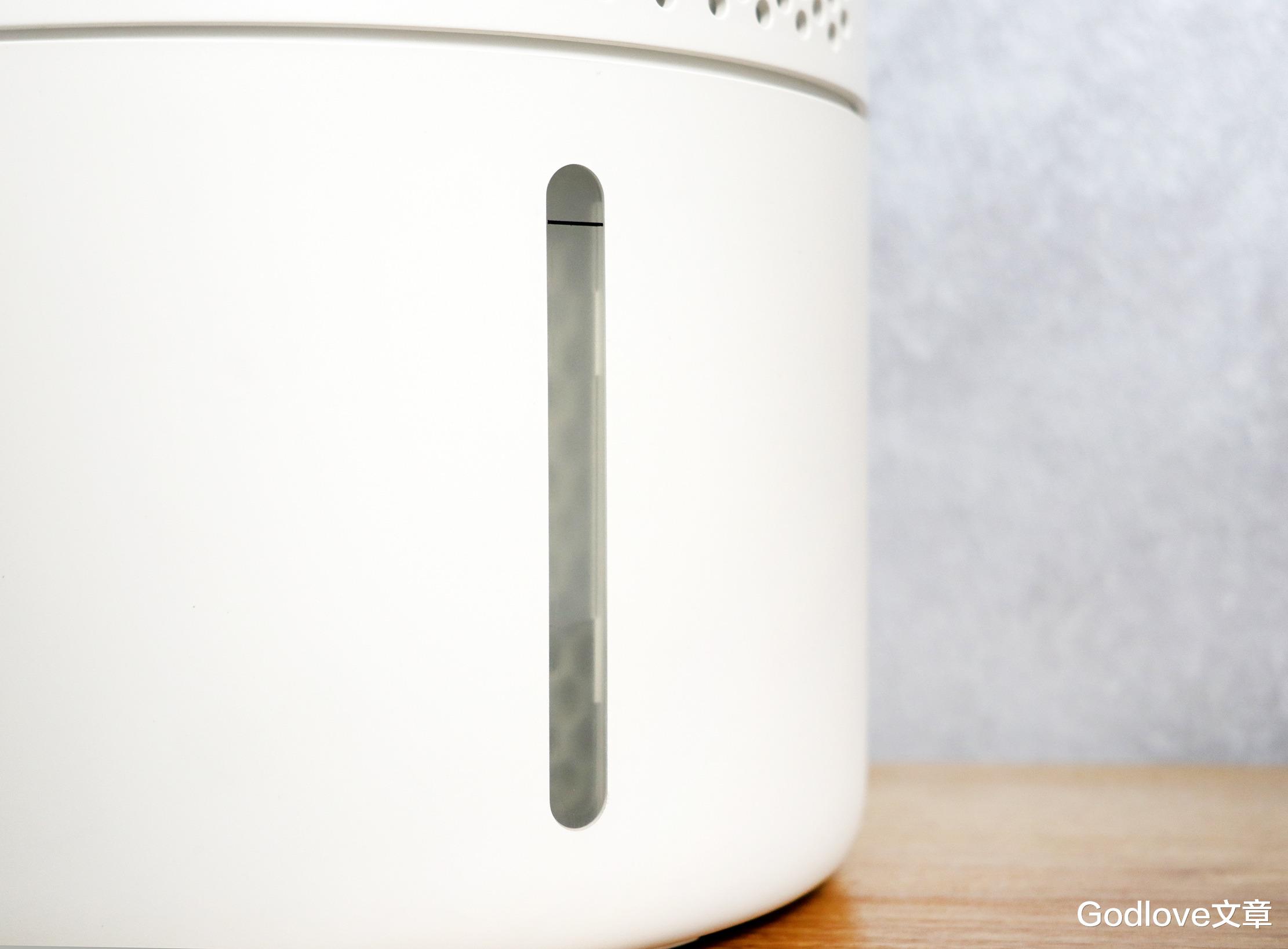 加湿器周身四个方位均有大面积的网孔,同时也能窥见内部的滤芯状态。