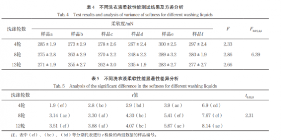 通过测试六种品牌洗衣液在0.2%浓度下,经4、8、12轮洗涤后的柔软性能,验证了新方法的有效性。