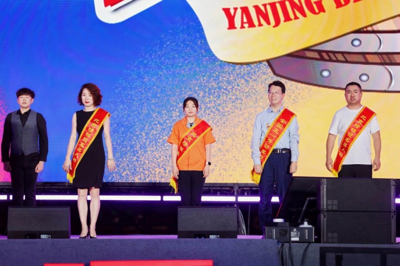 激动人心的开酒仪式将开幕式的氛围推向最高潮。在“燕京45年匠心酿造,45载荣耀征程”的庄严宣告中,象征2025年燕京啤酒荣耀征程的酒桶被隆重请上舞台。首先,亓伟伟、王蕊、赵学学、张中星四位为营造“顺义好风气”做出突出贡献的先进榜样代表登台接受敬意。