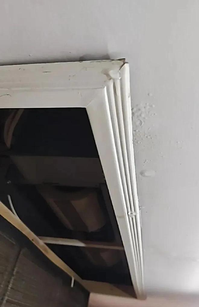 让人没想到的是第三年中央空调又漏水了,漏水位置的吊顶,没几天就鼓包了,还发霉了。