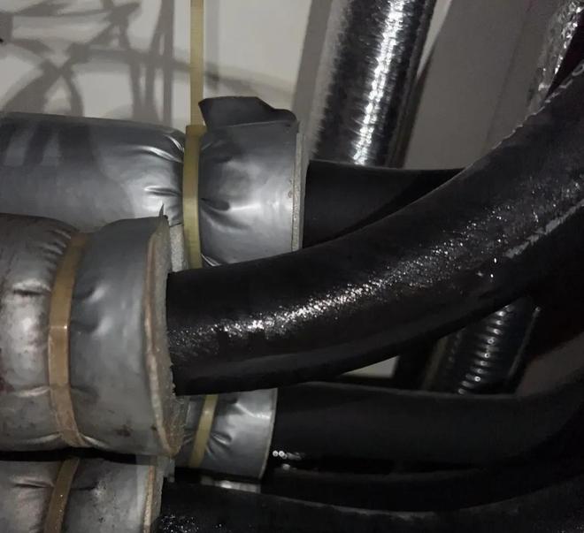 例如保温棉没有完全把管子包裹住,空气里的水蒸气就会在铜管外壁凝结成水珠,随着使用时间的增加,就有可能会往下漏水,最终的结果就是吊顶位置有漏痕迹,吊顶位置会往下滴水,甚至是发霉。