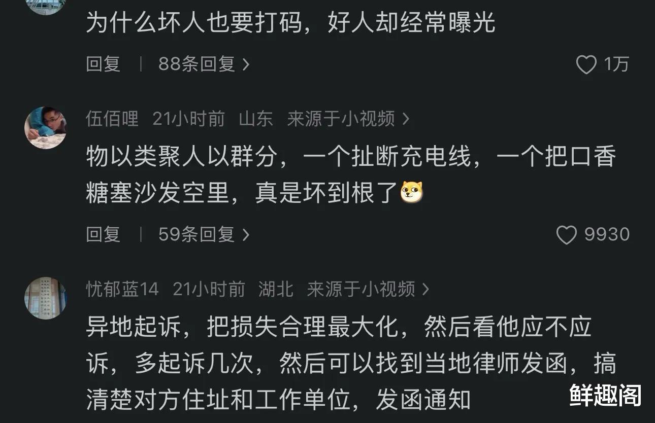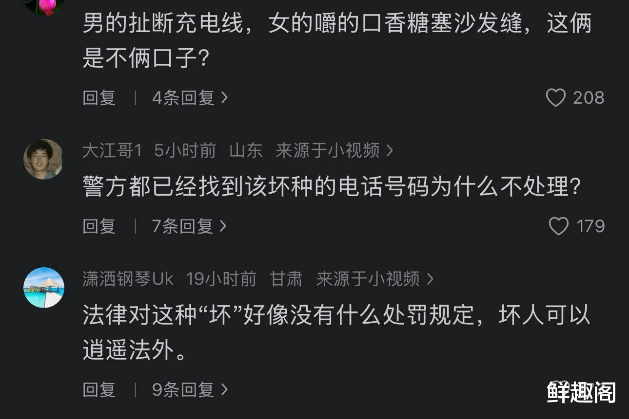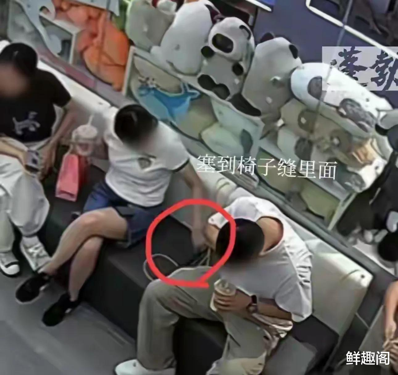 在确认没人注意后,他坐到沙发上,拿起几根充电线快速用力拉扯,扯断后直接丢在座位上。与此同时,同行的白衣女子在起身时,把自己嚼了半小时的口香糖塞进了沙发缝里。