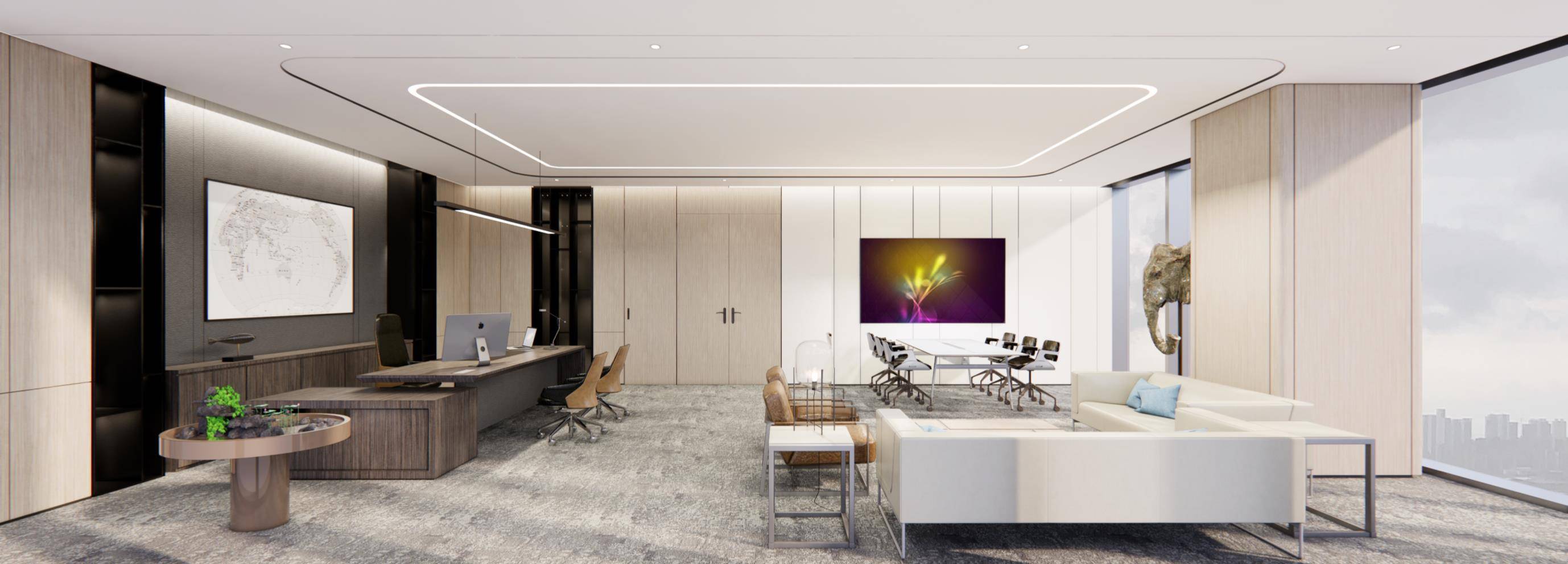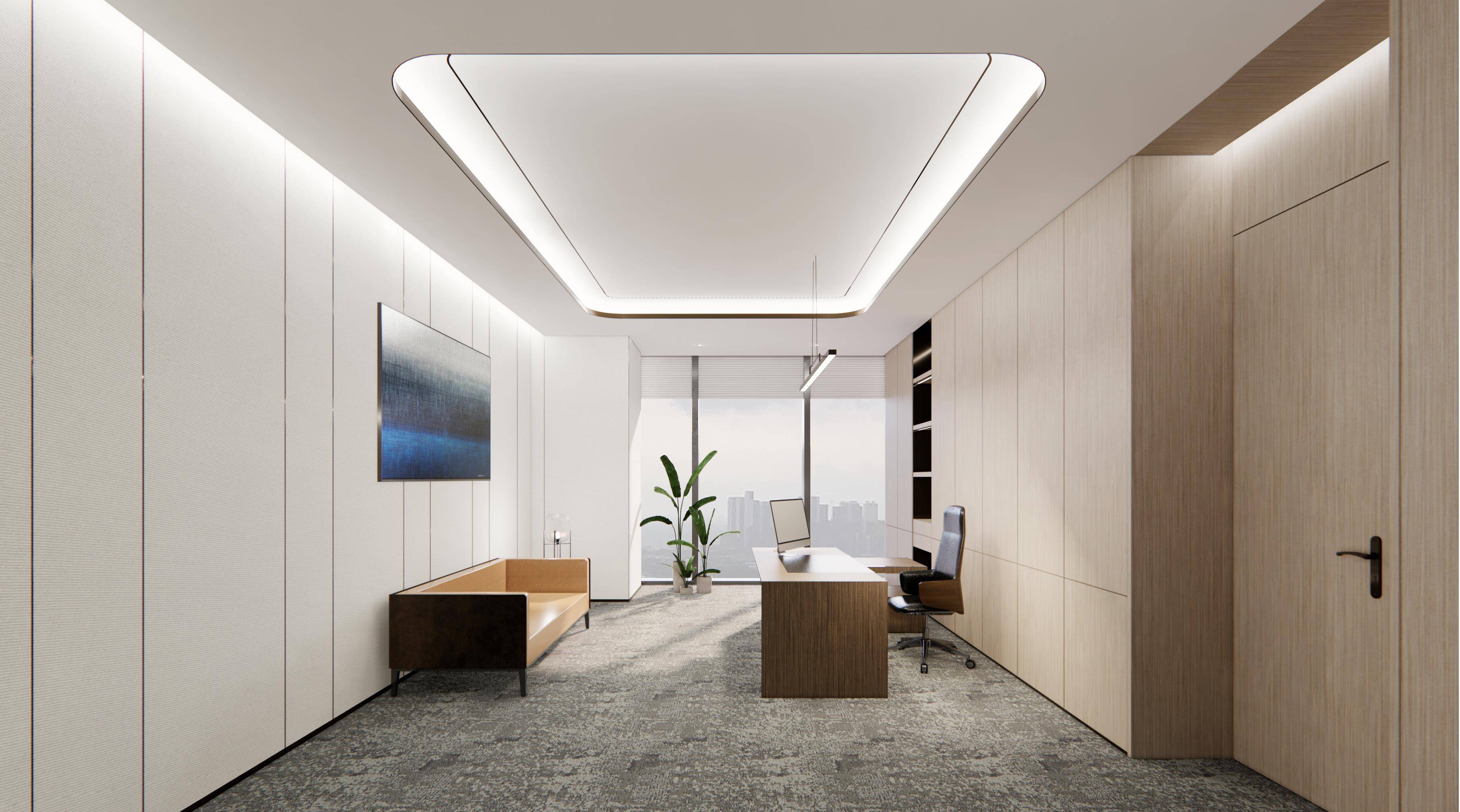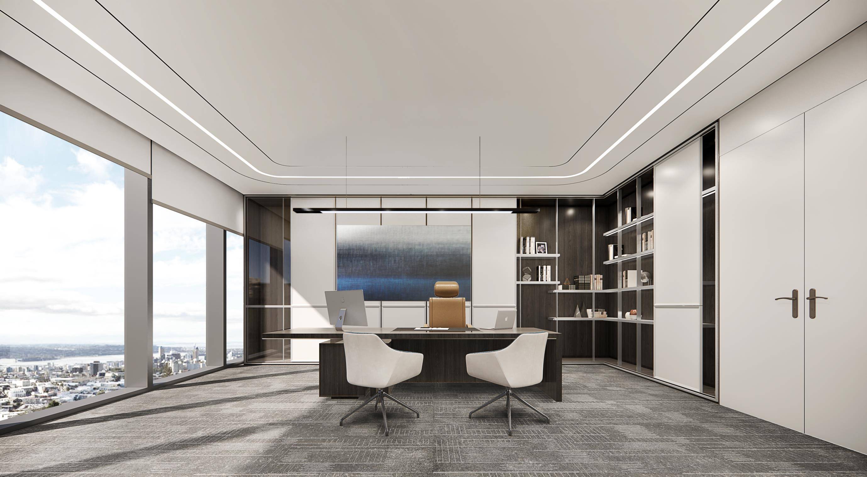 整体设计采用了简洁的线条和纯净的色调,营造出一种现代、专业的氛围。大面积的白色墙面和浅灰色地毯,搭配少量的蓝色元素,使空间显得干净、整洁且富有层次感。右侧的大面积玻璃窗引入了充足的自然光线,增强了室内外的视觉连通性,使空间显得更加宽敞、通透,同时也提升了整体的舒适度。前台区域的设计既美观又实用,弧形的前台造型独特,增加了空间的柔和感。旁边的展示架和休息区则满足了不同的功能需求,提供了一个多功能的空间环境。通过不同材质的搭配,如光滑的墙面、柔软的地毯和竖条状的装饰板,增加了空间的质感和视觉层次感。