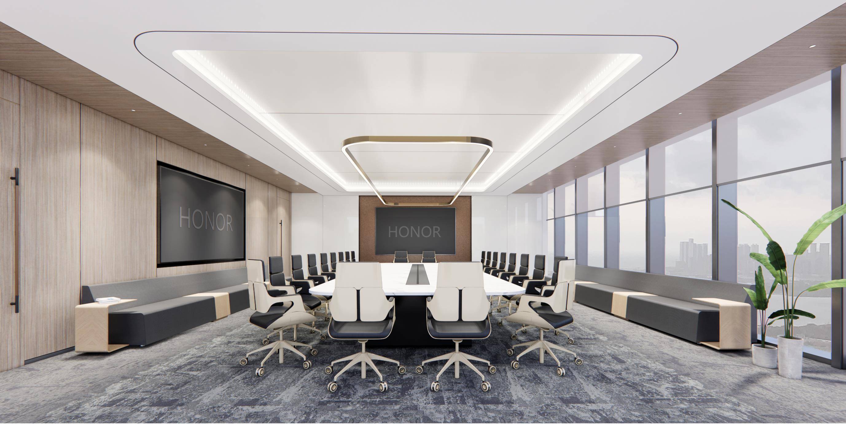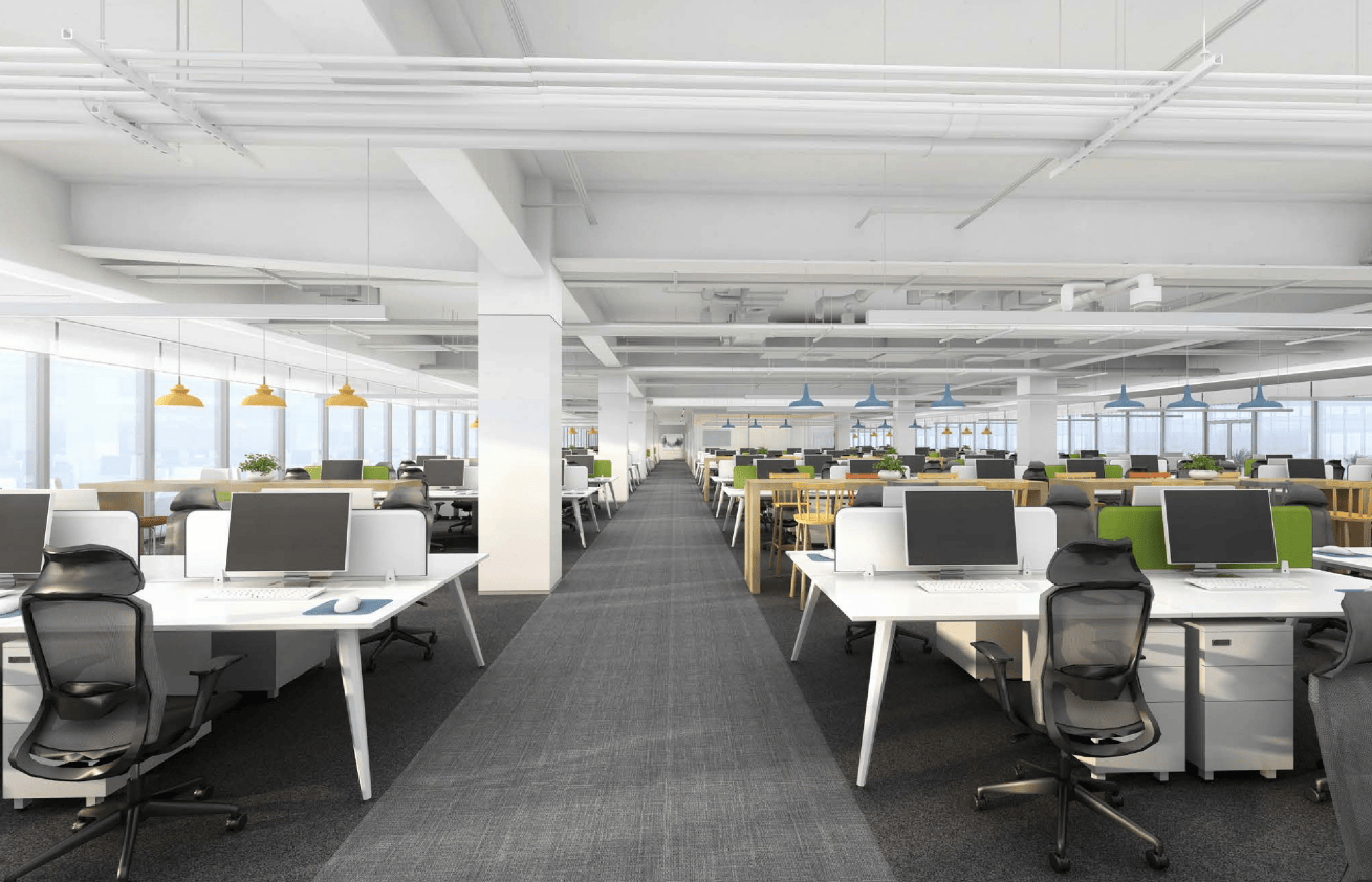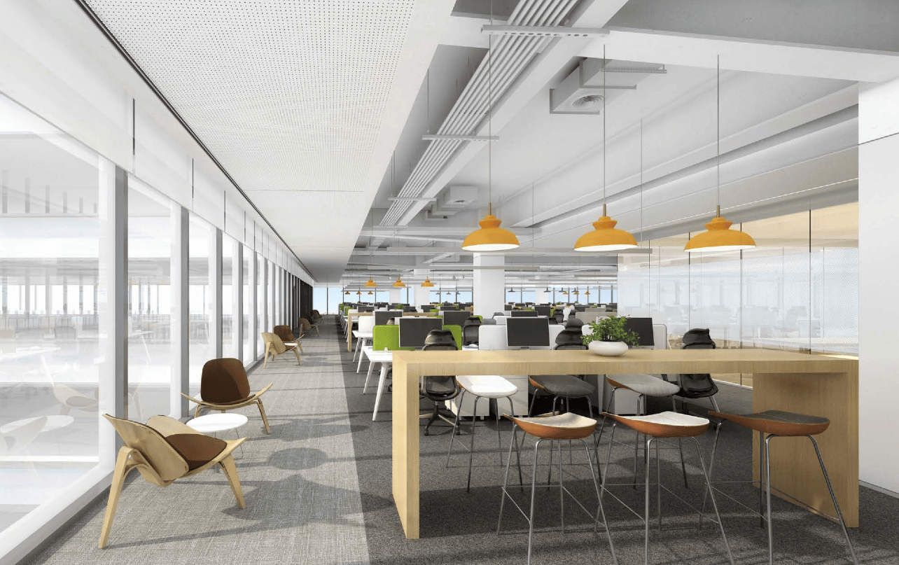 整体设计采用了简洁的线条和纯净的色调,营造出一种现代、专业的氛围。大面积的白色墙面和浅灰色地毯,搭配少量的蓝色元素,使空间显得干净、整洁且富有层次感。右侧的大面积玻璃窗引入了充足的自然光线,增强了室内外的视觉连通性,使空间显得更加宽敞、通透,同时也提升了整体的舒适度。前台区域的设计既美观又实用,弧形的前台造型独特,增加了空间的柔和感。旁边的展示架和休息区则满足了不同的功能需求,提供了一个多功能的空间环境。通过不同材质的搭配,如光滑的墙面、柔软的地毯和竖条状的装饰板,增加了空间的质感和视觉层次感。