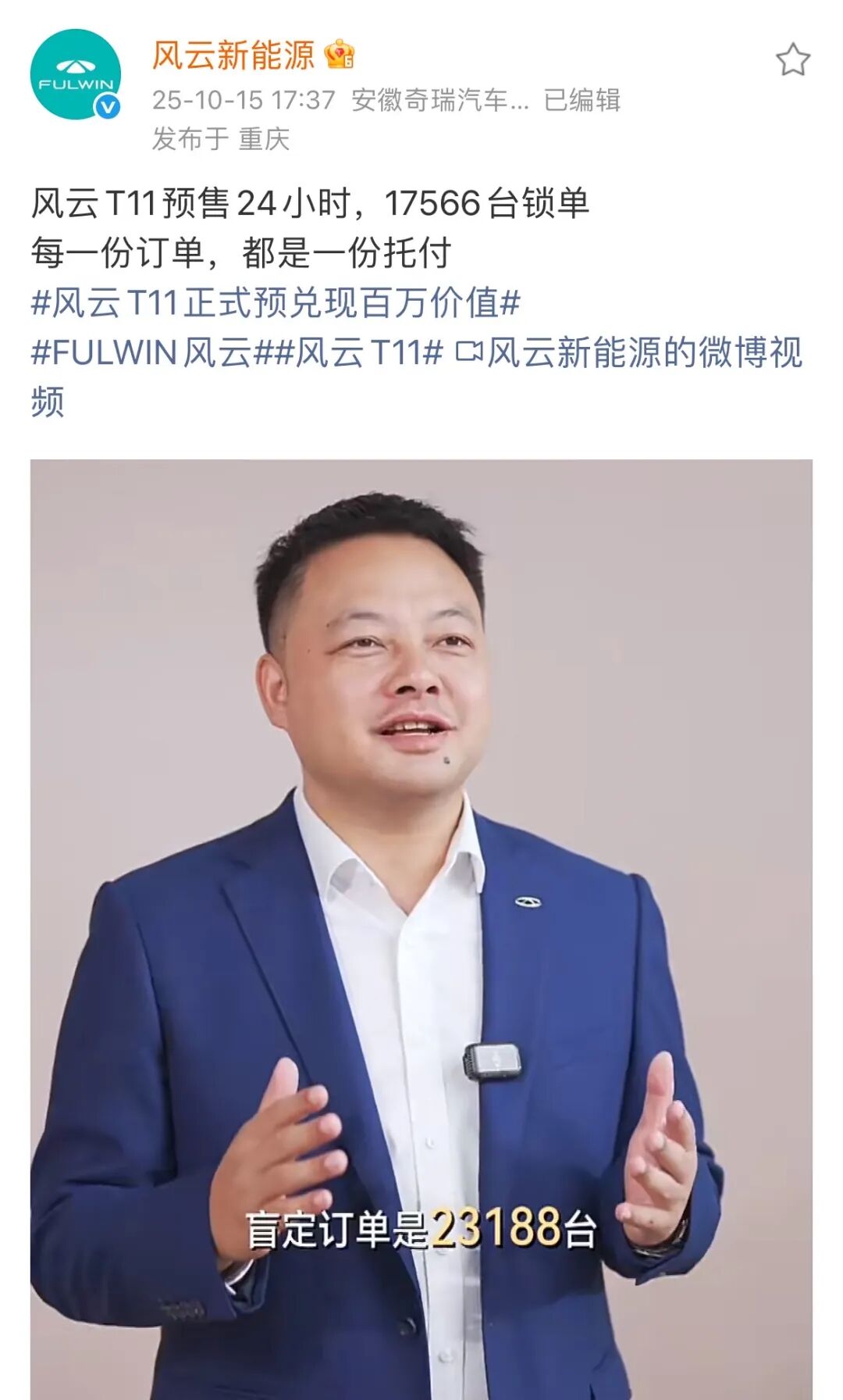 “风云T11预售24小时,17566台锁单。”10月15日,奇瑞汽车执行副总裁李学用在微博中透露了上述消息。注意,这不是小订,而是直接锁单。在前一天的10月14日,风云T11在芜湖预售。风云T11被网友戏称为芜湖GLS,这款新车起步预售价19.99万元,采用6座布局,搭载1.5T增程动力,预计将于年内上市。