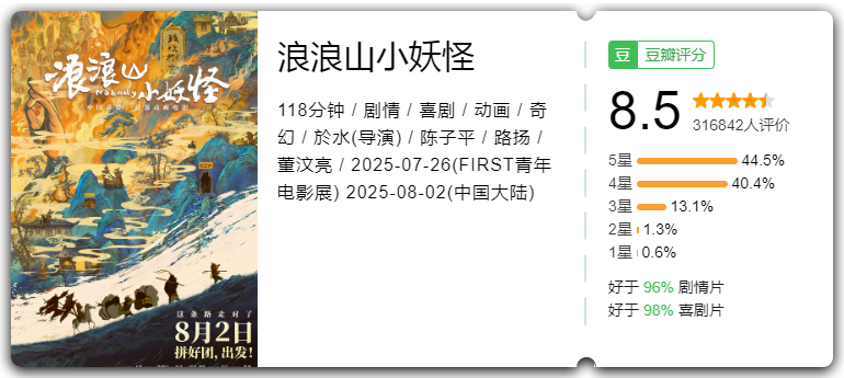 暑期档小黑马《浪浪山小妖怪》,目前上映20天,累计票房已破11亿,预测票房17亿。