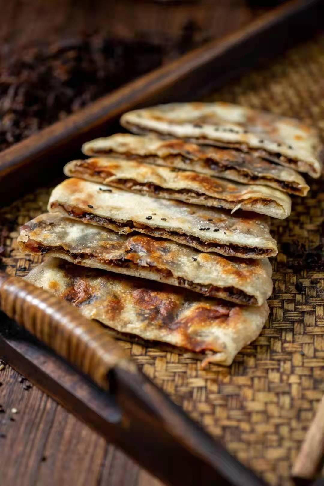 刚出炉的烧饼烫得没法下手,得用油脂裹着,左右手来回倒腾。咬第一口要格外小心,“咔嚓” 一声,酥皮像雪花似的往下掉,烫得人直咧嘴,却舍不得松口。外层的酥皮薄如纸,层层分明,带着炭火的焦香;内里的面皮吸饱了馅料的油脂,软糯有韧劲。