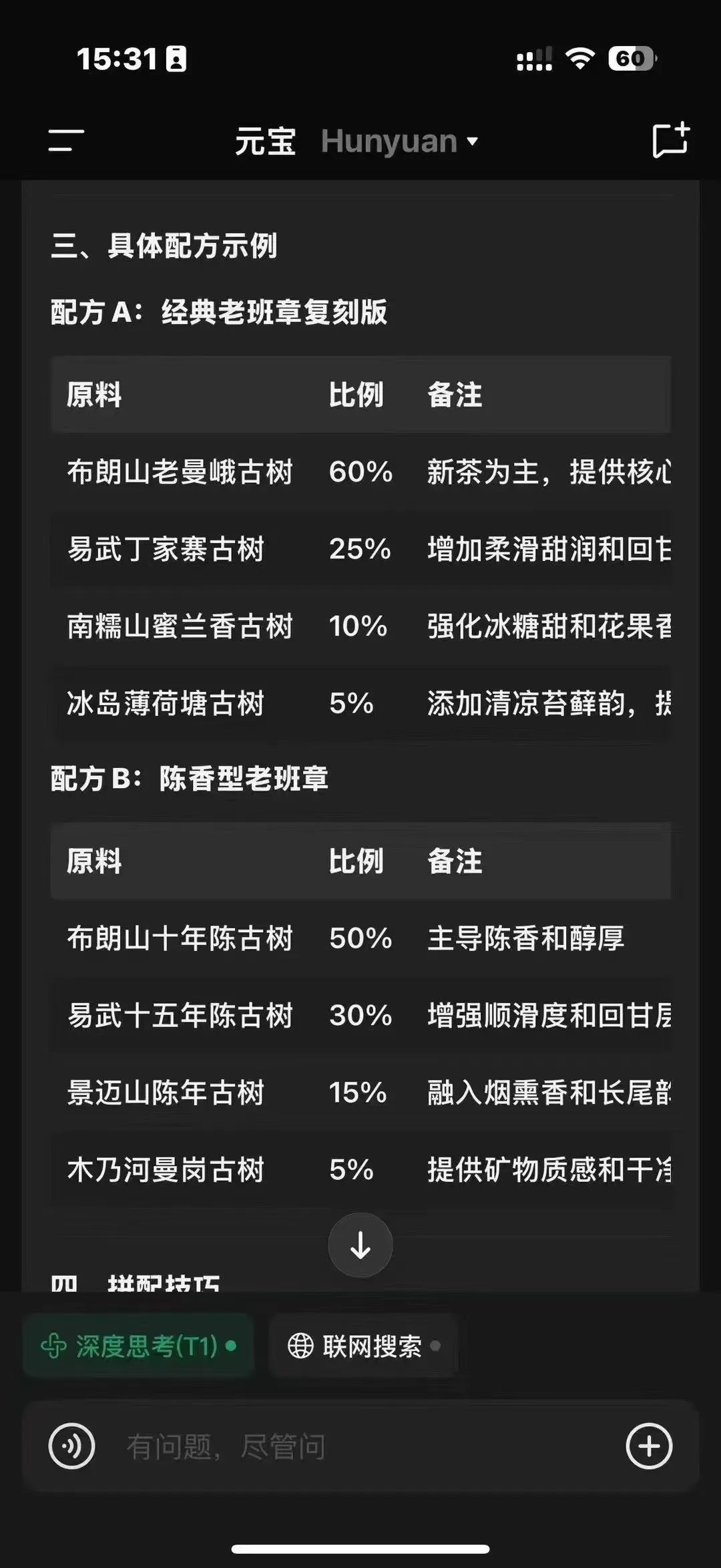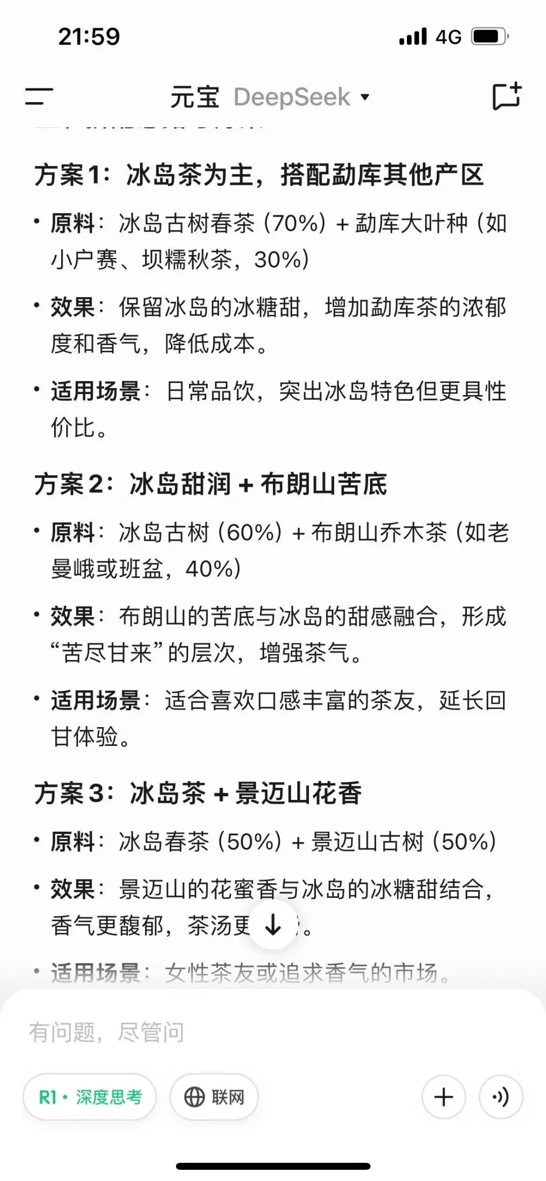 前段时间我在朋友圈发了一个混元大模型有关拼配茶的答案或者叫做一种说法,我的问题是,如何拼配出一款带有老班章茶味的茶来?答案相信大家当时也都看到了(下图所示),它连普洱茶的基本知识都是有误区的。为了弥补之前把混元大模型弄成deepseek的遗憾,后面几天我又将问题问了一遍deepseek,只是将问题换成了如何拼配出冰岛老寨古树茶?它给我的答案与混元大模型给我的相差不大,其中给出了一种方法,用冰岛老寨的古树茶与老熟茶相拼,其实这种生熟相拼的玩法在2007年之前流行过一段时间,只不过当时是为了人工制作出所谓的老茶而创造出来的一种方法,和拼配出一款高质量的普洱生茶没有太大关系。