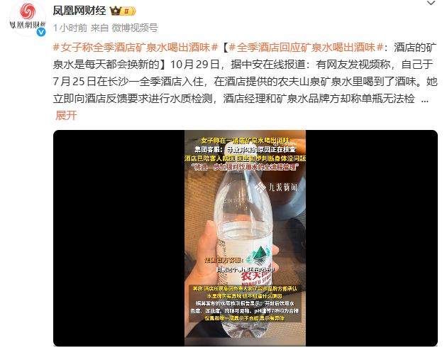 2025年10月30日消息,据凤凰网财经等多家媒体报道,近日有消费者反映,自己入住长沙的全季酒店,饮用酒店提供的农夫山泉矿泉水时发觉口味异常。经过水质检测发现,渉事全季酒店提供的农夫山泉矿泉水确有异味。全季酒店所属华住集团负责人与矿泉水品牌方也均承认确实有异味,但不知道什么原因。