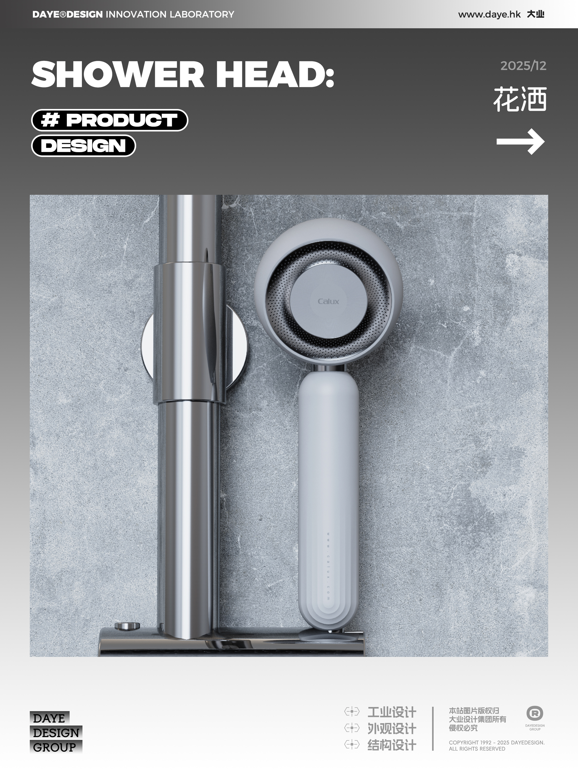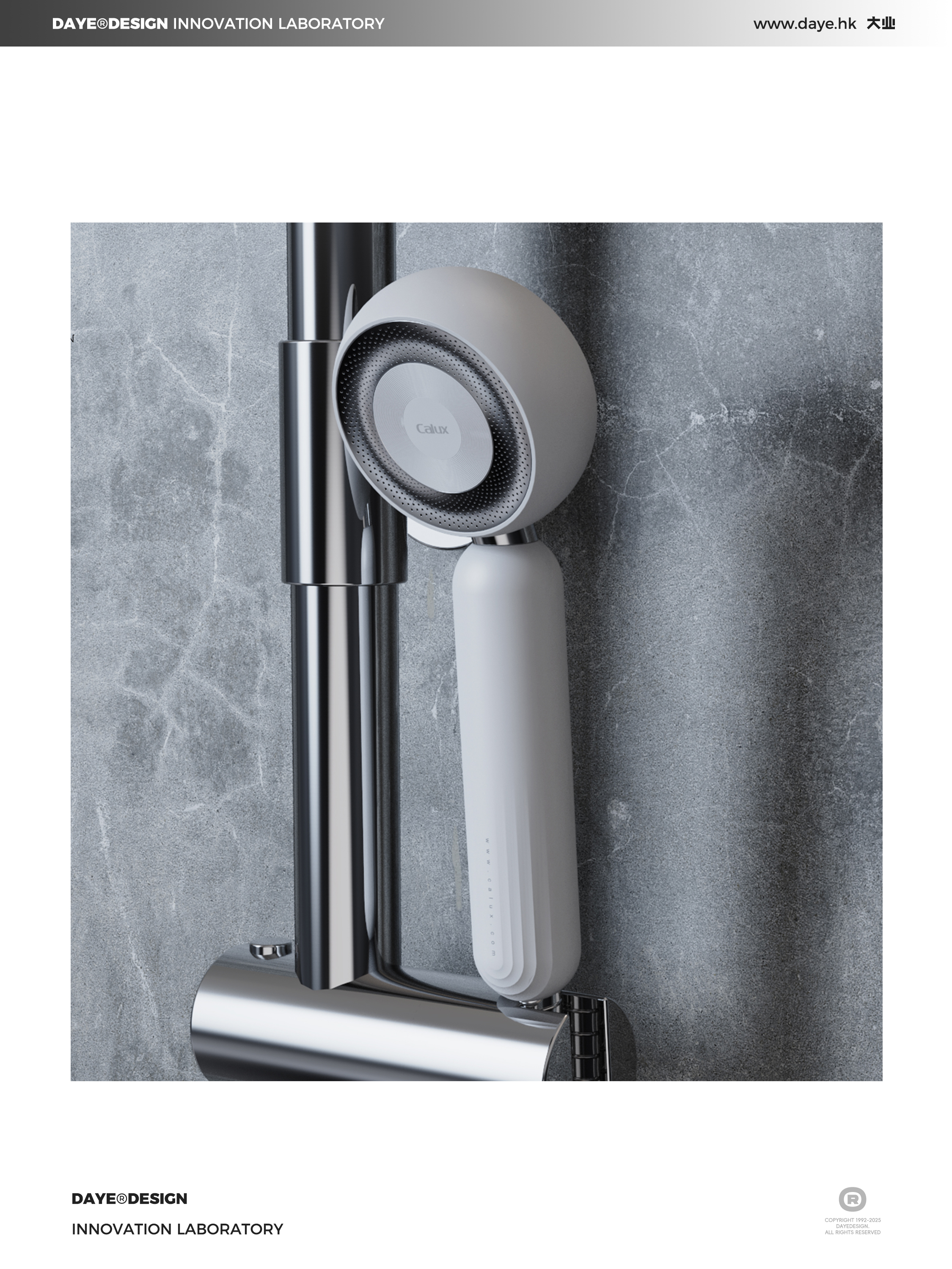 整体遵循无棱角圆润造型,花洒头的环形设计既符合水幕扩散的功能逻辑,又通过几何的形态语言消解卫浴工具的生硬感;手柄的流线弧度贴合手掌握持曲线,搭配底部的凹凸纹理设计,既保障了淋浴时的握持稳定性(水渍环境下防滑),又让外观具备触觉美学 的实用价值。