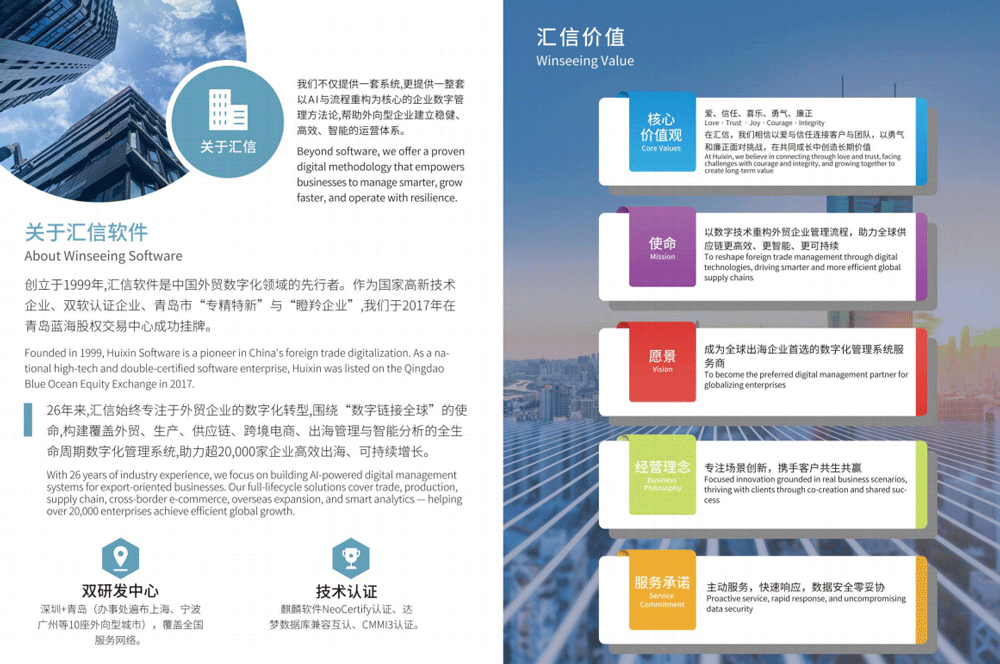 汇信软件基于协同供应商管理的思想,配合供应链中各环节的业务需求,依托大数据和云计算研发,帮助外向型企业打通外贸供应链上下游的“企业门户+ERP管理解决方案”。