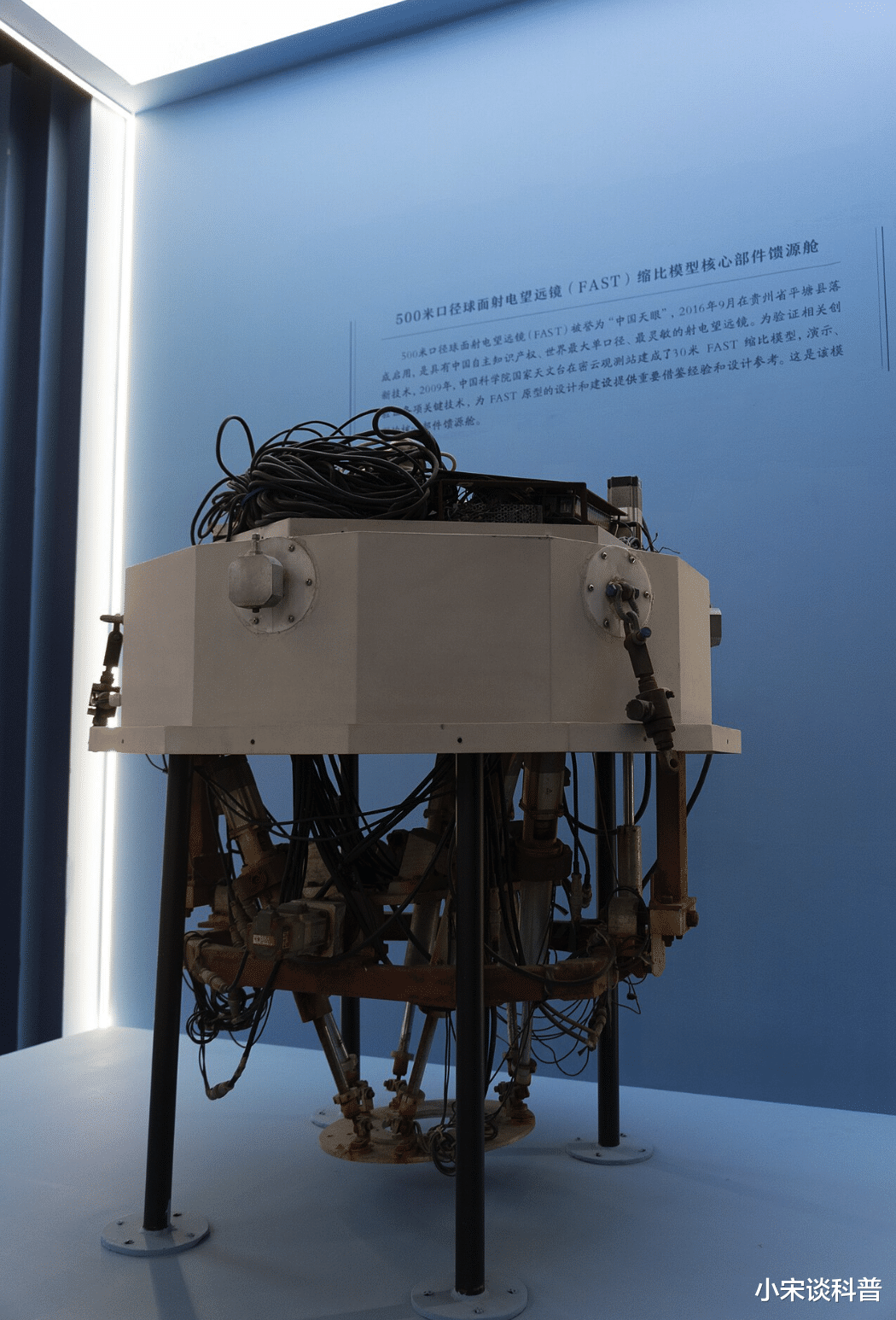 在主反射器上方,有六个高塔支撑着一个轻型的电缆机器人"馈源舱"。接收天线安装在斯图瓦平台的下方,可以提供精细的位置控制,并补偿风运动等的干扰,使指向精度可以高达8弧秒。