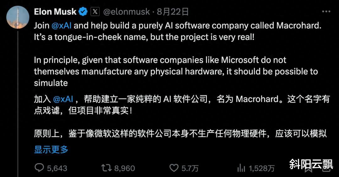 埃隆・马斯克新公司 “巨硬”(Macrohard)的命名,堪称科技史上最精彩的挑衅之一。中文的 “巨” 对 “微”,“硬” 对 “软”,英文的 “Macro” 对 “Micro”,“hard” 对 “soft”,这场针对微软的 “贴脸开大”,揭示了科技巨头之间前所未有的 AI 主导权争夺战。