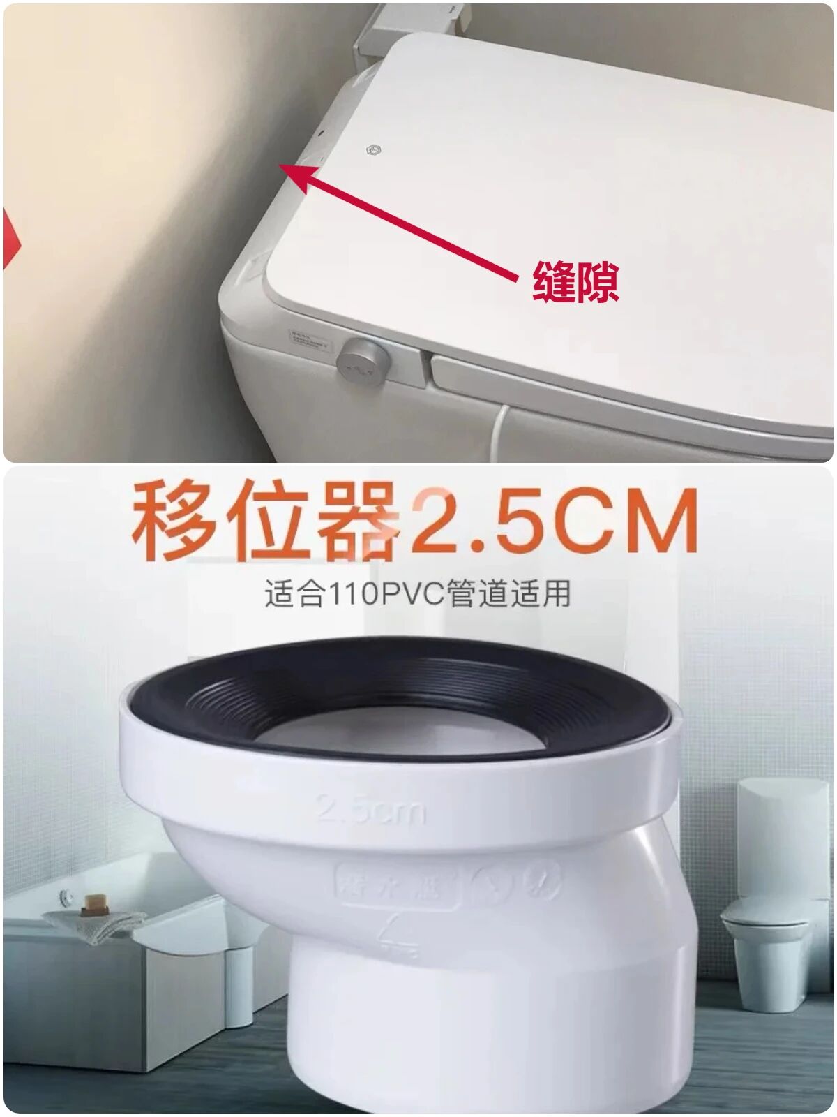 ▲如果坑距不是正好300mm或400mm的标准规格马桶,可以加移位器,马桶可以前后移动约2cm,满足后方严丝合缝。后方缝隙太大