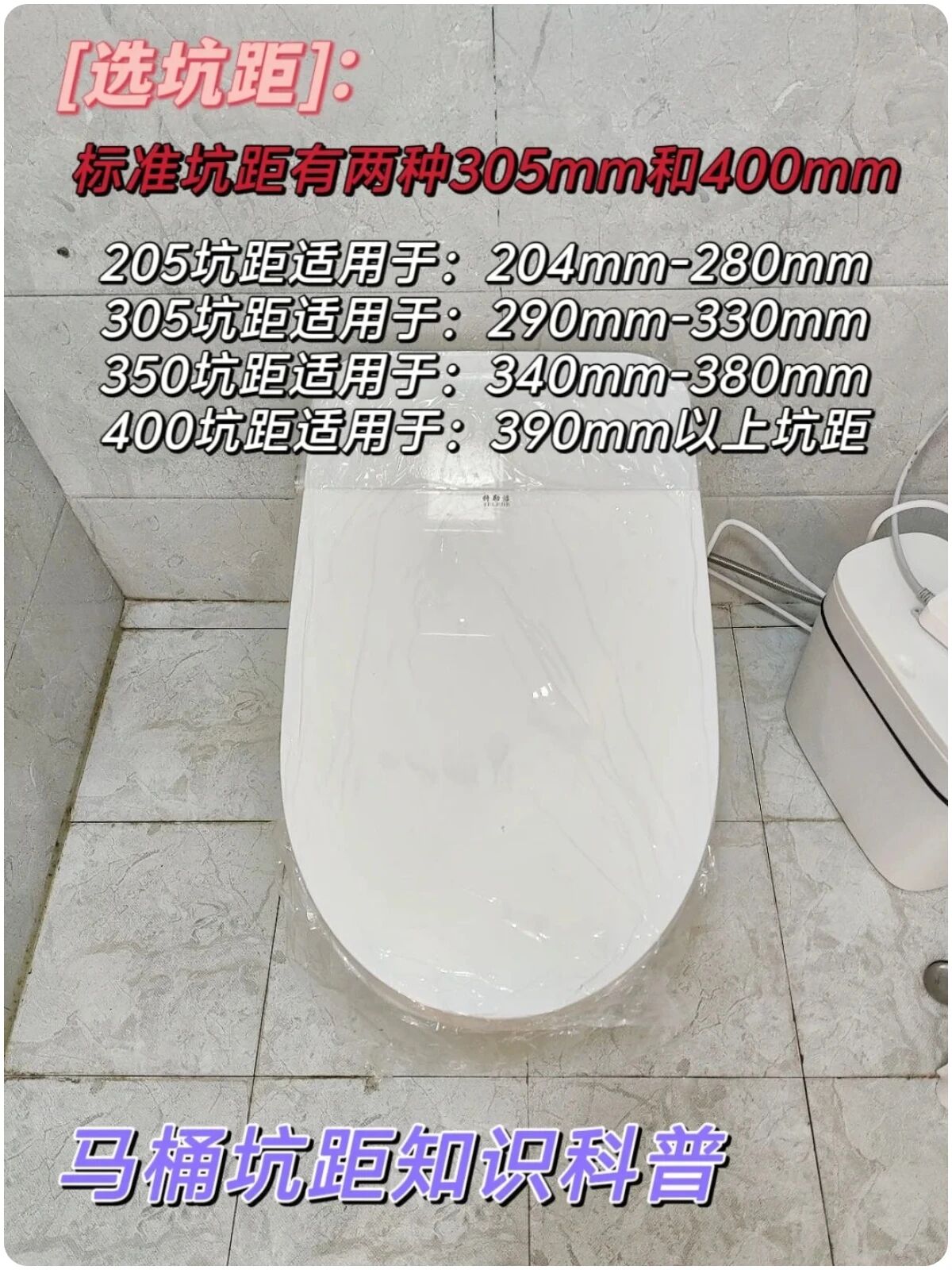 ▲马桶坑距直接影响马桶的选择。①标准留300mm坑距,买300mm坑距马桶,不一定就能严丝合缝,不同马桶厂商尺寸也不尽相同;②坑距只是作为参考,起码不会出现因坑距装不上而退货问题,如果想严丝缝合安装,购买前应咨询马桶厂商,询问详细尺寸最为稳妥。坑距和马桶大小的关系