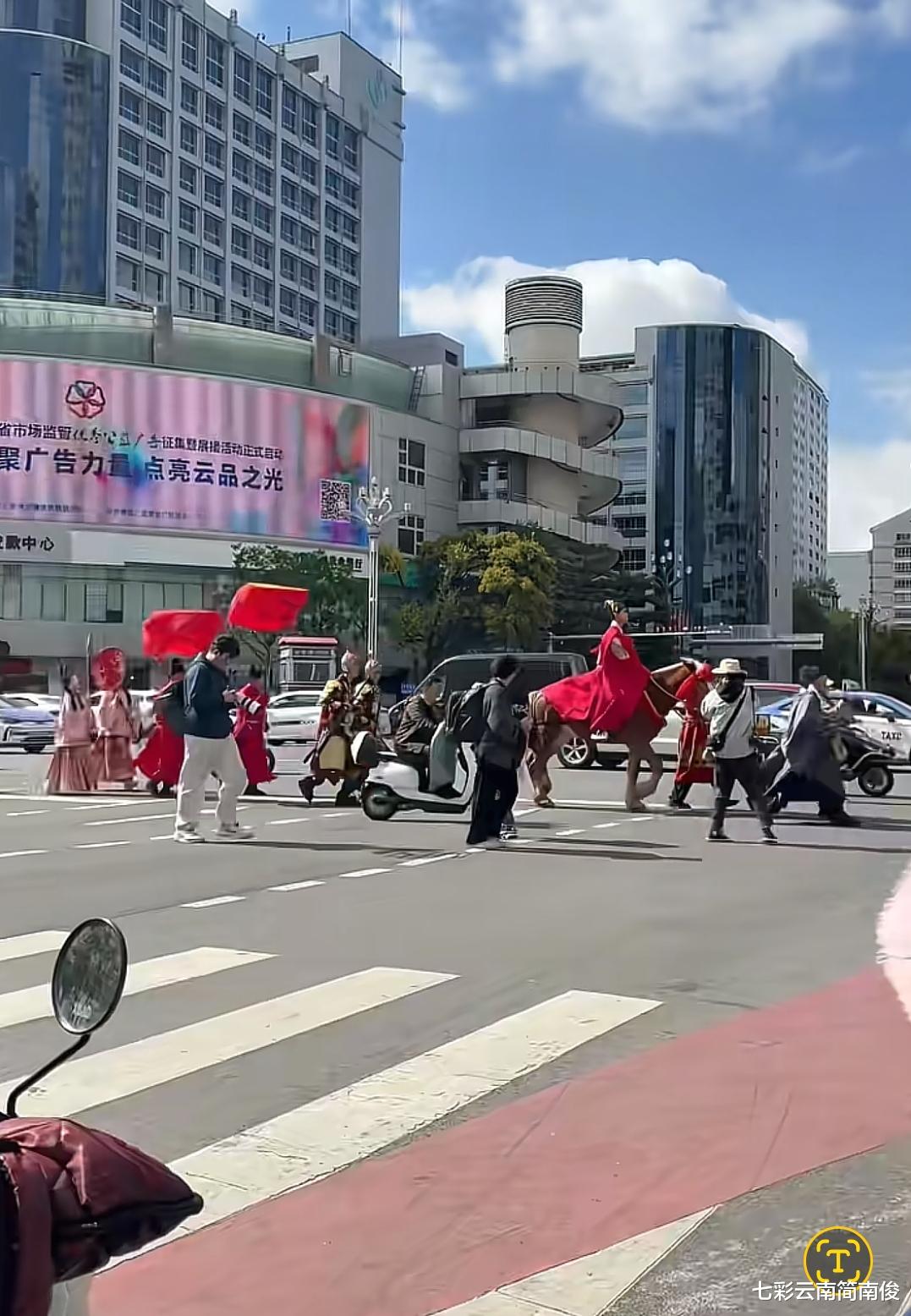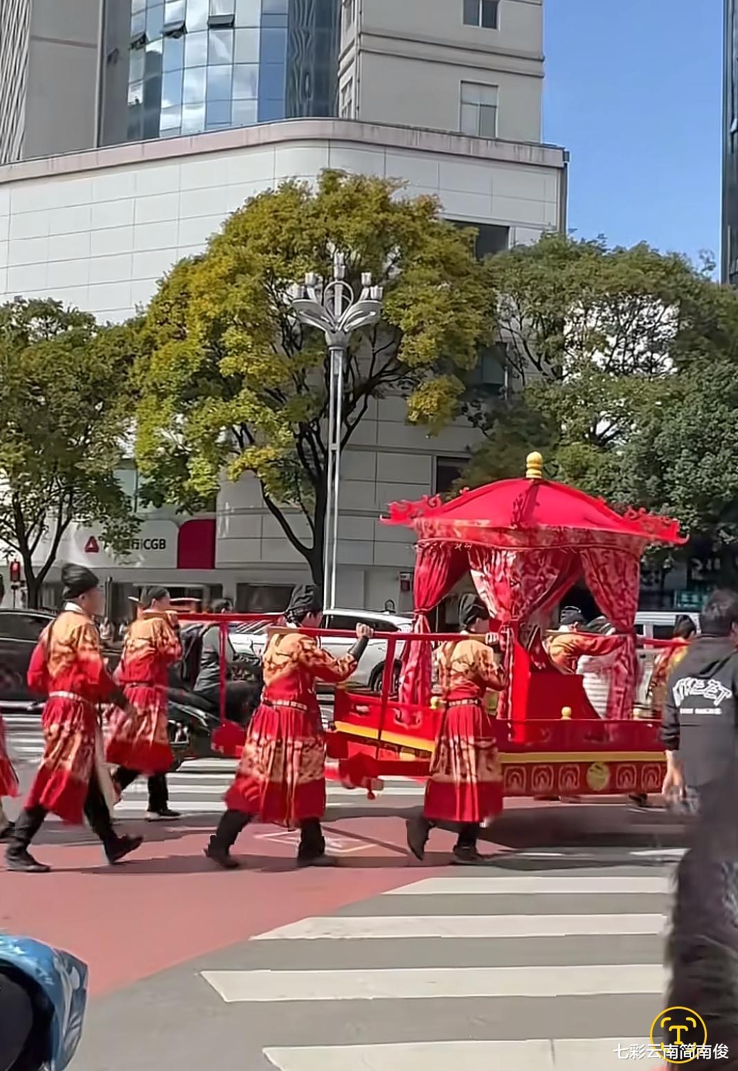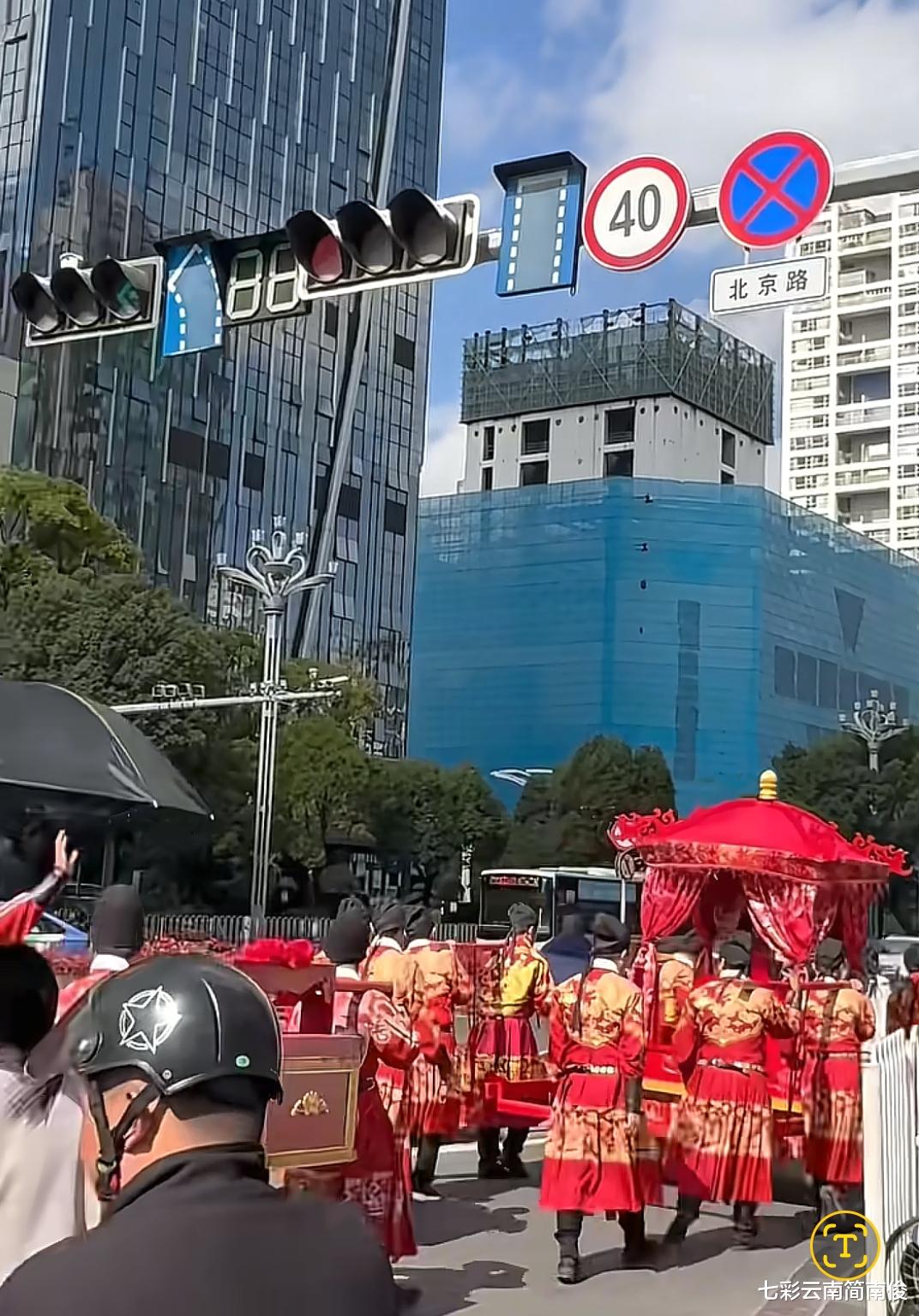经观察获悉,11月15日12时许,云南省昆明市盘龙区北京路街头惊现古装婚礼,众多云南昆明市民在盘龙区北京路、东风东路共同见证这一庄严而惊艳时刻。云南省昆明市市民目睹此情此景,感到惊叹不已,高度赞誉“顶流婚礼”。云南昆明街头惊现古装迎亲婚礼,新郎骑高头大马侍卫穿金色铠甲。据现场流传视频画面显示,迎亲队伍浩浩荡荡,宛如长龙,十里红妆,凤冠霞帔,八抬大轿,明媒正娶,梦回唐朝,洋溢欢乐喜庆和古典气息,惹人注目,聚焦关注。缘起三世定今生,佳偶天成度百年,惟愿执子之手,与卿相濡以沫。如此新奇一幕,闪现云岭大地,为彩云之南增添无限人文魅力,引发云南省昆明市众多市民竞相围观拍摄,堪称“七彩云南春城昆明靓丽风景”,触动心弦,拨动人心。更为亮眼的是,新郎官身穿红艳喜庆服饰,骑着高头骏马,两名侍卫腰间挂着宝剑,身穿金色铠甲,宛如新郎官中了“新科状元”一般,极具排场,迎亲队伍浩浩荡荡,行走于街头闹市,令云南省昆明市广大市民大开眼界,叹为观止,催人赞叹“逐梦前往赏河山风情走遍中华神州万水千山,举目赏云感神秘梦幻醉美诗意远方彩云之南”。