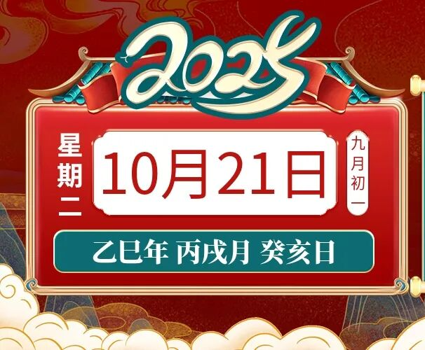 2025年10月21日,星期二,农历九月初一 (乙巳年丙戌月癸亥日),法定工作日。
