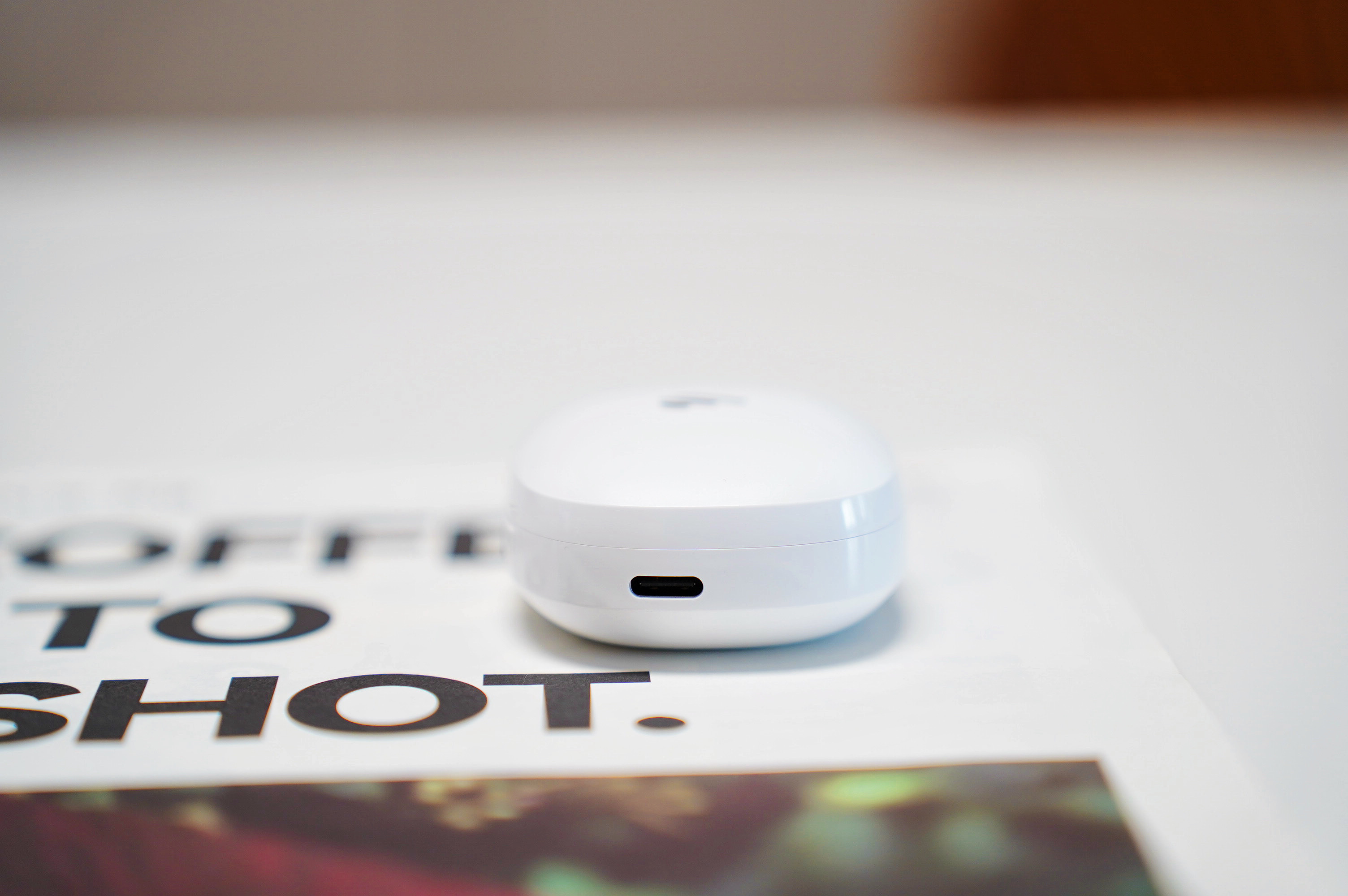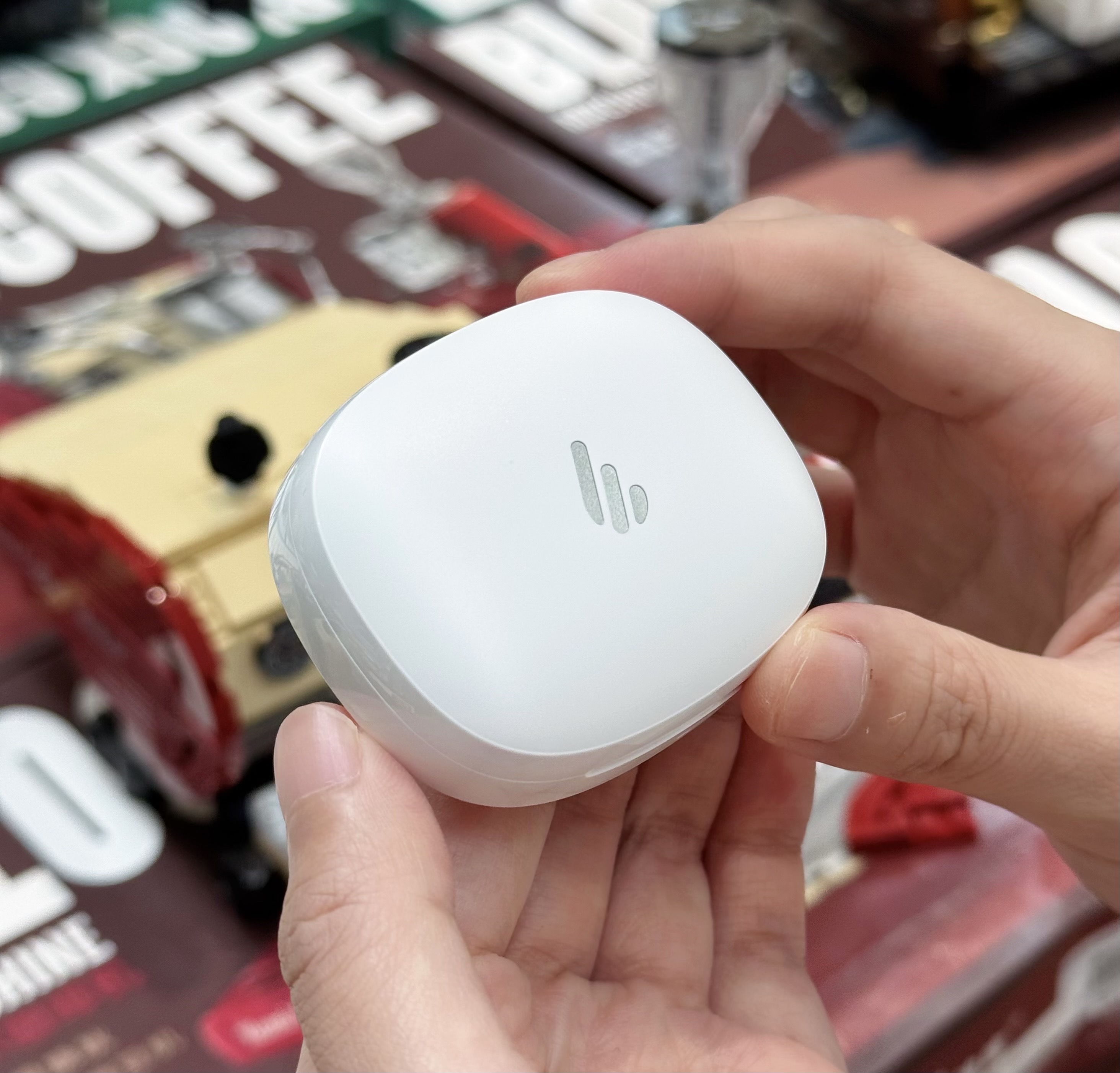 充电盒采用圆润的鹅卵石造型,mini巴掌大小,太可爱啦!细腻的磨砂外壳握感温润,正面的漫步者LOGO 与右侧的Type-C接口,整体设计简洁利落。