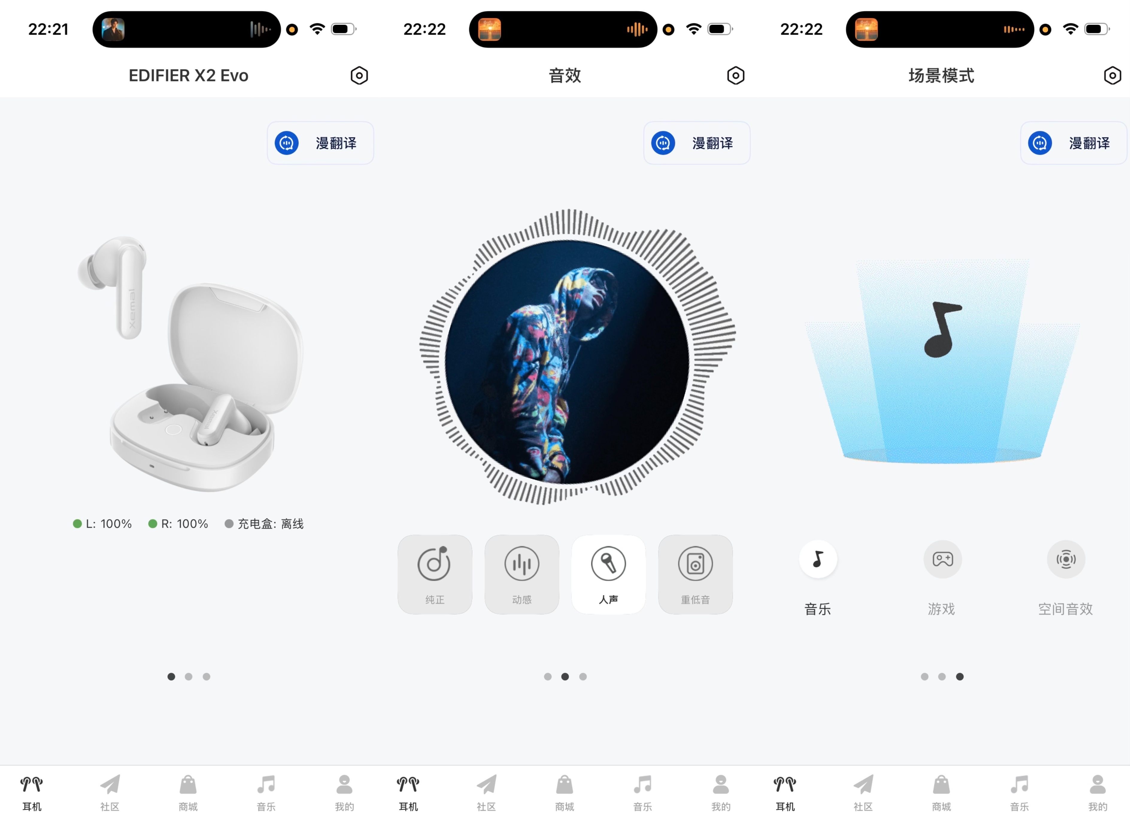 另外,打开漫步者APP的音效设置界面,它贴心准备了纯正、动感、人声、重低音四种预设音效,再加上音乐模式、游戏模式、空间音效三种场景模式,就像给音乐加了层能量buff,分寸感拿捏得很到位!