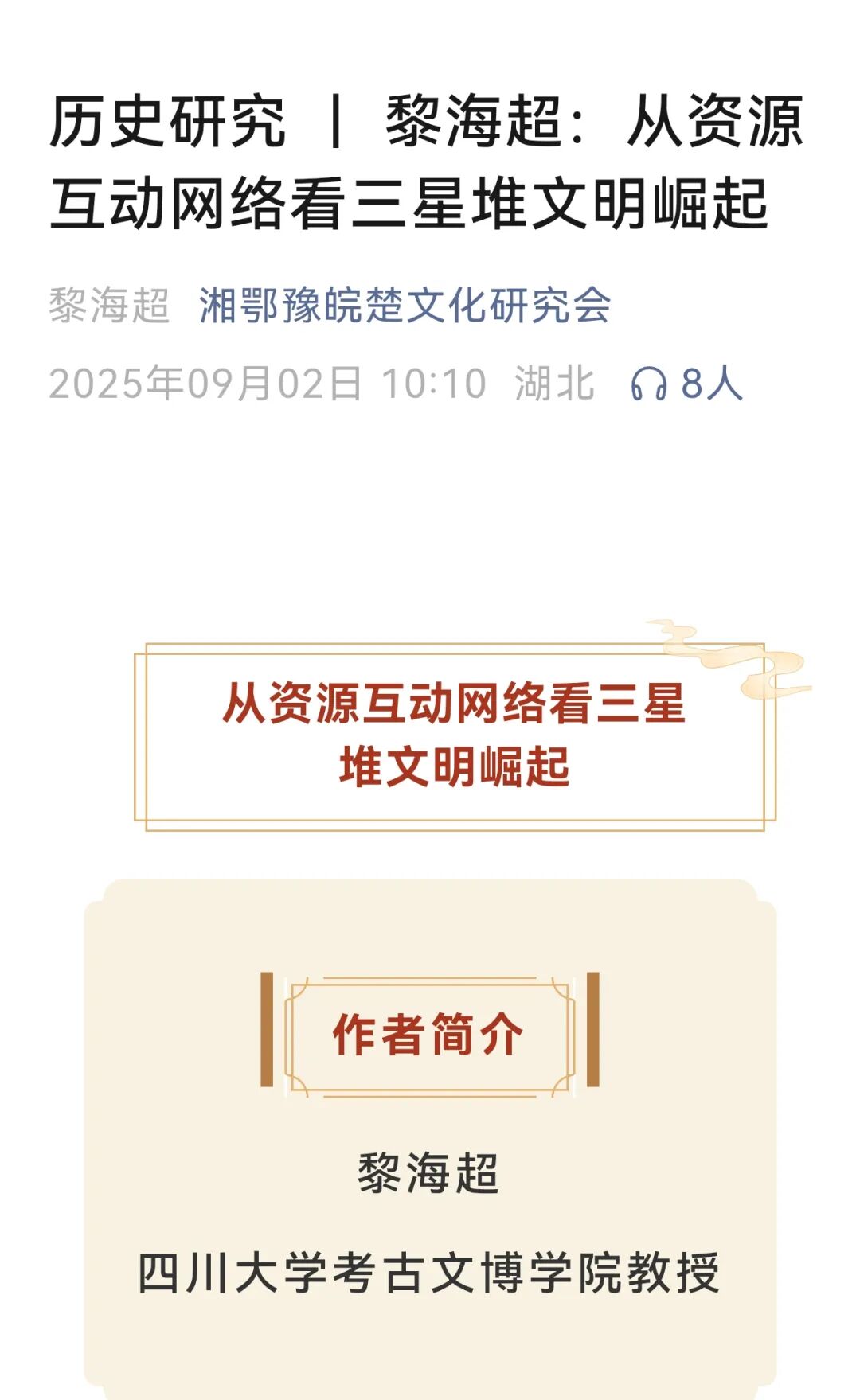 四川大学考古文博学院教授、四川大学三星堆遗址考古队现场领队黎海超在近期发表的《从资源互动网络看三星堆文明崛起》一文中指出“三星堆文明成果多从中原、西亚等地输入” ,只字不提三星堆是否对其它地方产生影响。这种观点忽略了文明交流中 “双向流动、互哺共生” 的底层规律。