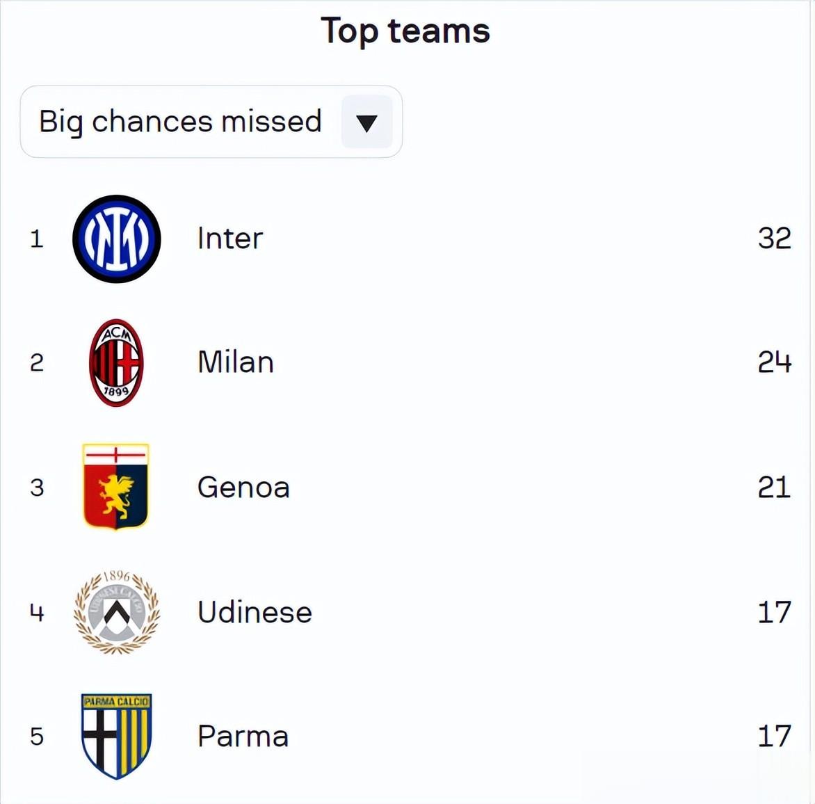 在意甲赛场,国米32次浪费良机,以极大差距领先第二名(24次浪费良机的AC米兰)。