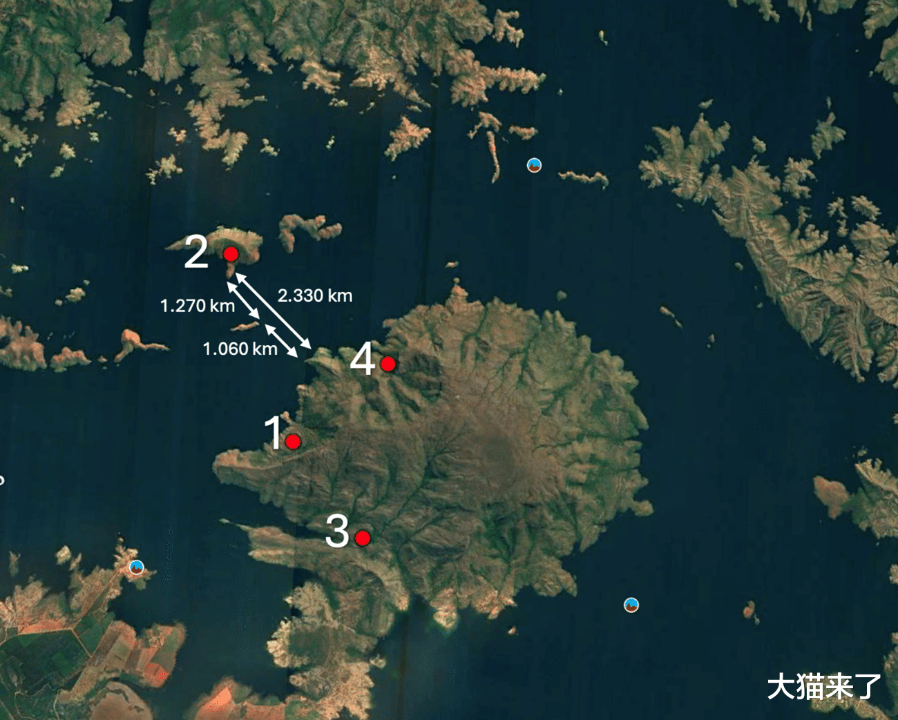 如下图所示,拍到美洲豹的位置分别在“1”和“2”两点。在大陆和海岛之间,有一块裸露的岩石,距离大陆和海岛的最短距离分别是1.06千米和1.27千米。因此,美洲豹有可能先游了1.06千米到岩石上稍作休息,再游了1.27千米到岛屿上。