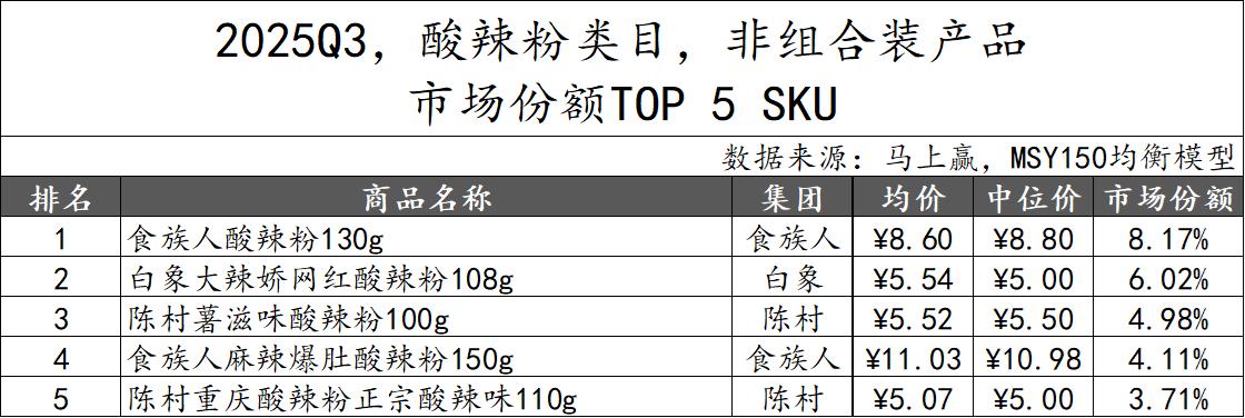 2025Q3,酸辣粉类目TOP5集团分别为食族人、陈村、今麦郎、白象和莫小仙,合计市场份额47.92%,集中度较低但环比有轻微提升。前三集团的市场份额较为接近,位列第一的食族人市场份额同比下降,而二、三位的陈村和今麦郎市场份额同比上涨。第四名、第五名的白象和莫小仙则市场份额同比下跌。