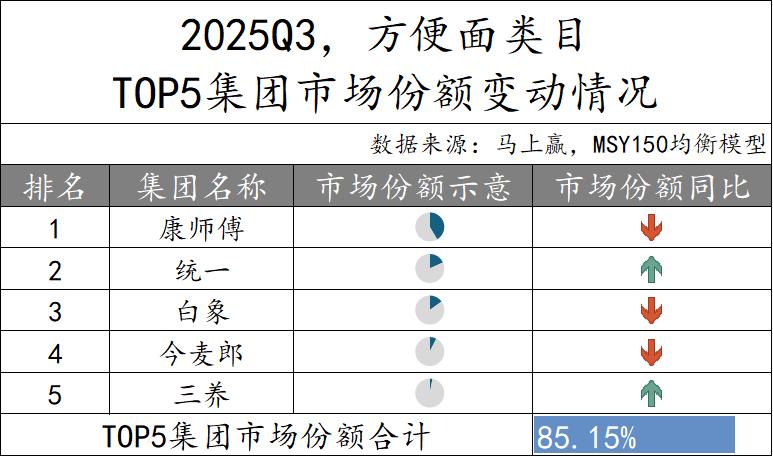 2025Q3,方便面类目的TOP 5集团由康师傅、统一、白象、今麦郎和三养组成,市场份额合计85.15%,市场集中度高且相比上个季度有所提升。其中,康师傅、白象和今麦郎的市场份额同比下降,而统一、三养的市场份额则同比上升。