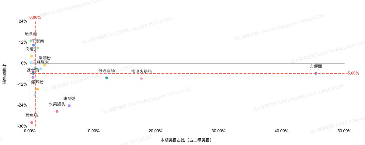 从占比的同比变动来看,方便面在占比断层领先的背景下,占比同比进一步增长约2%,在大类中的重要性进一步提升;常温火腿肠、低温香肠则基本保持持平;相比来说,速食粥、水果罐头的占比下滑较为严重,均同比下滑约1%。