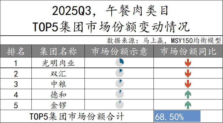 2025Q3,午餐肉类目TOP 5集团分别是光明肉业、双汇、中粮、德和和金锣,合计市场份额68.5%,环比上季度有极轻微的提升。其中光明肉业市场份额最高,是唯一市场份额超过1/4的集团。前三名的市场份额同比在下降,而第四名的德和、第五名的金锣市场份额同比出现上升。