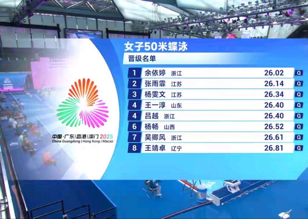 在所有选手中,年轻小将余依婷的表现尤为引人注目。她的出发反应迅捷,入水干净利落,没有一丝多余的动作。水下蝶泳腿的强劲推进力让她在开局便占据了有利位置。进入途中游阶段,她的划水幅度与频率结合得天衣无缝,每一次手臂的划动都充满了力量感,身体在水面上保持着极高的流线型姿态,最大限度地减少了水的阻力。她就像一颗出膛的炮弹,坚定而迅猛地冲向终点。当她的指尖触碰到池壁时,电子计时器上跳出了26.02秒的数字。这个成绩不仅让她在所有参赛选手中独占鳌头,更宣告了这位新生代选手在短距离蝶泳项目上的强大竞争力。她以无可争议的头名身份,轻松晋级半决赛,为晚间的决战拉开了完美的序幕。