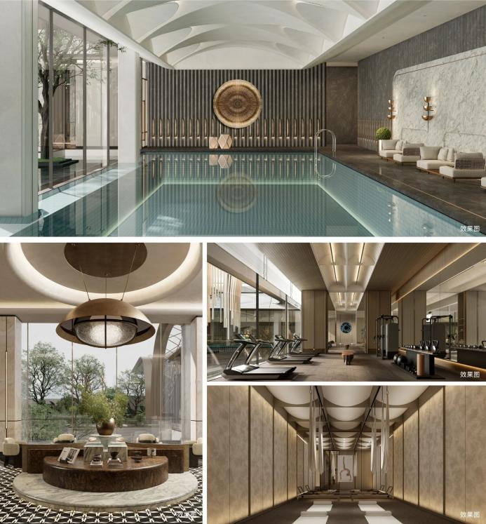 约1500㎡高奢会所规划恒温泳池、私宴厅、健身房等八大功能空间,兼顾日常休闲与圈层社交需求。