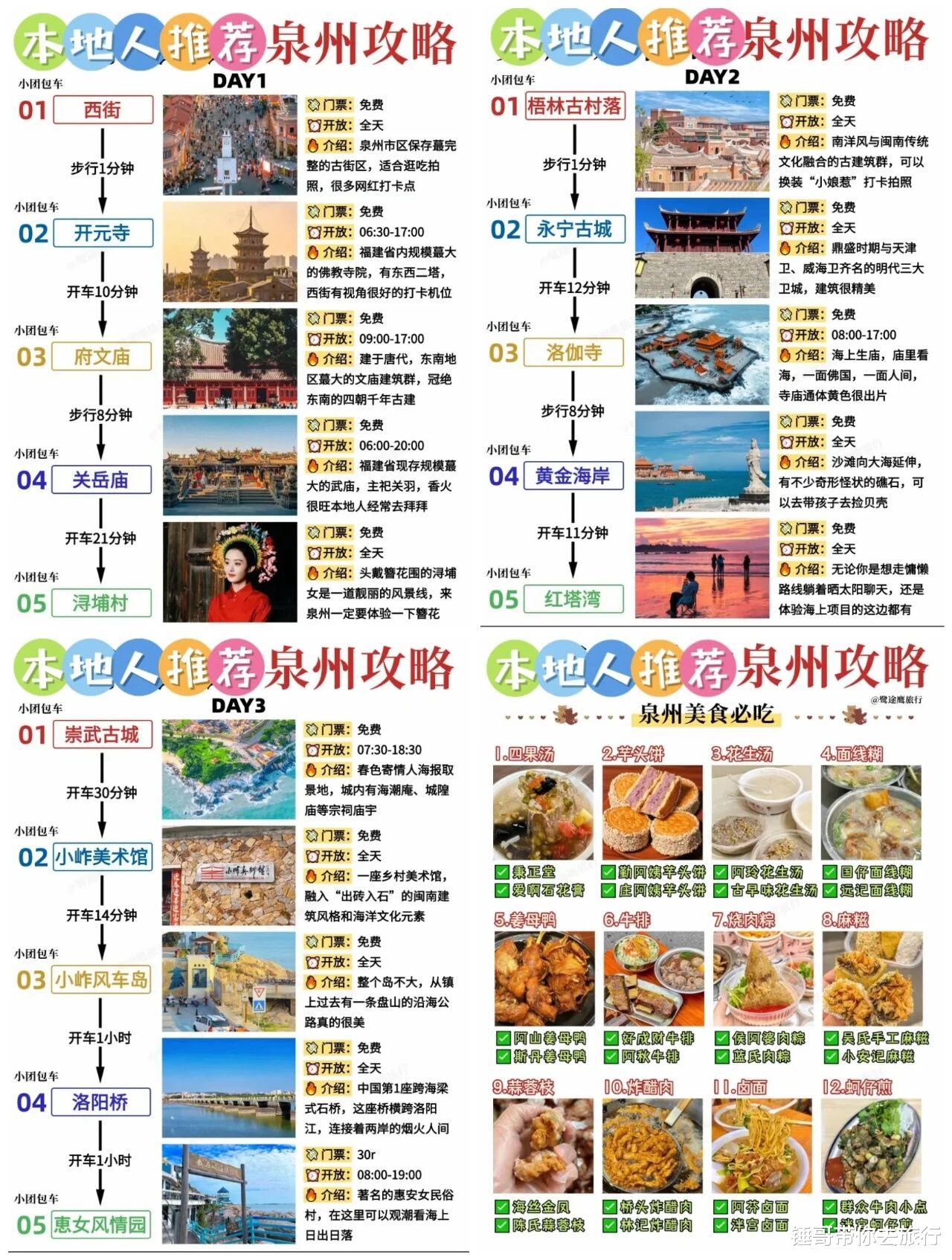 ✅交通攻略:高铁直达泉州站,市区内公交、共享单车出行便利,部分景点间打车更省时。